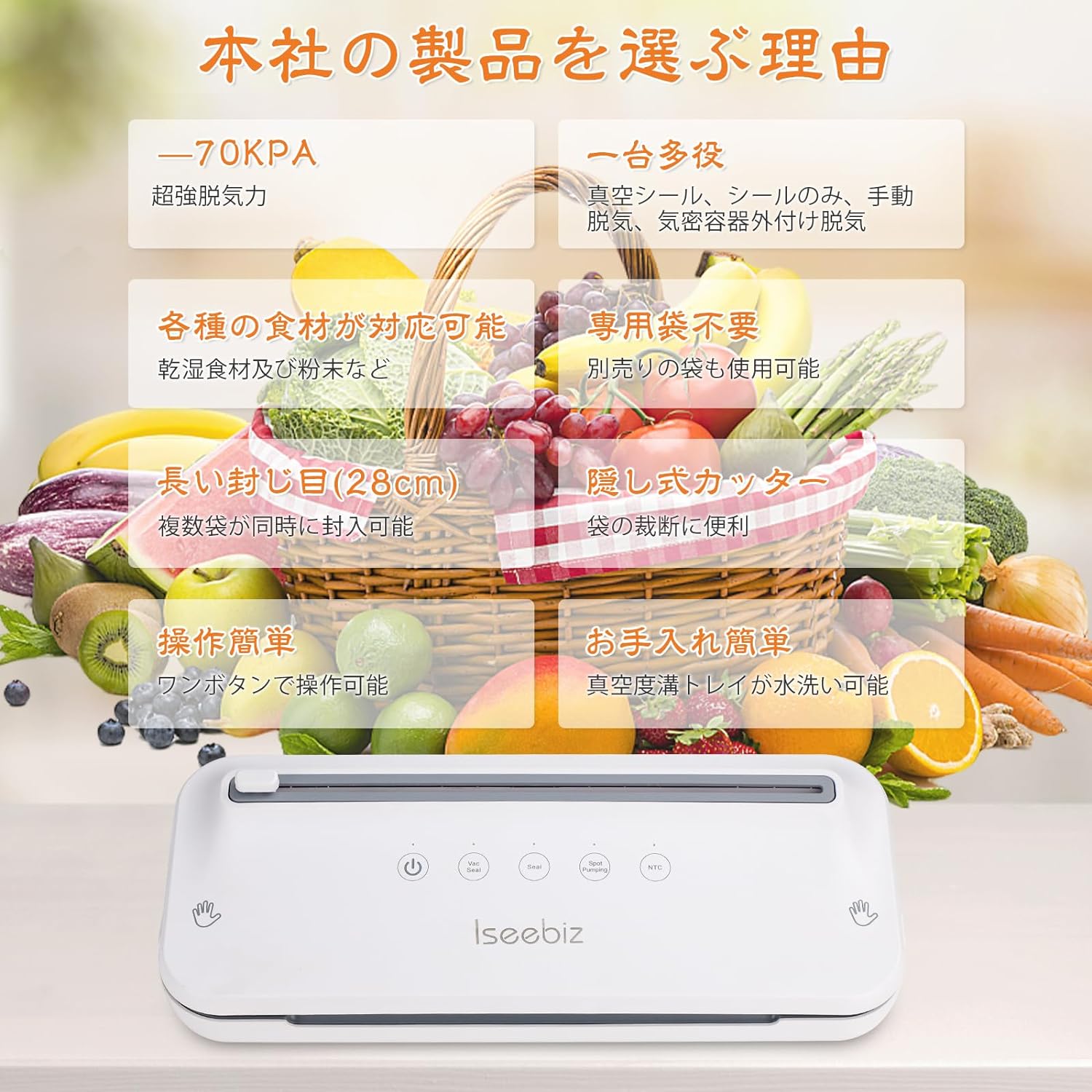 【BF期間限定20倍P付】真空パック機 Iseebiz 吸引力-70Kpa 家庭用 フードシーラー 専用袋不要 真空保存 乾湿対応 外付け脱気 最大幅28cm対応