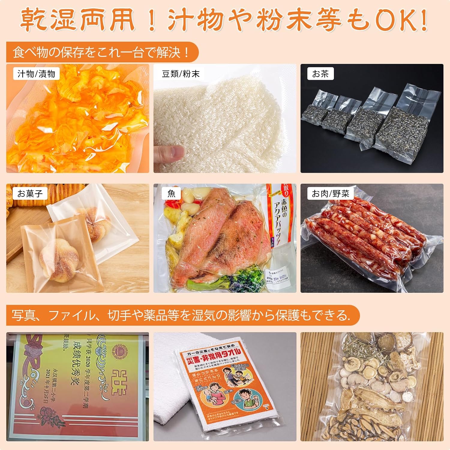 商品情報 商品詳細 脱気力:-70Kpa。商品サイズ:約37.5*15*6.5CM。製品重量:約950g。定格電圧:AC110V 50/60HZ。定格消費電力:80W。シール可能幅:最大限28CM。対応できる真空パック用袋の厚さ:0.15~0.4mm。付属品:本体×1、取扱説明書×1、真空用チューブ×1、電源ケーブル×1。※文中の「真空」は完全な真空状態のことではありません。JIS規格における「大気圧より低い圧力の気体で満たされた空間内の状態」です。 -70Kpaの強脱気力&過熱保護機能 1-この真空パック機は-70Kpaの脱気力で短い時間で空気を抜き、食材を長く新鮮に保存できます。2-安全性を高めるために、本真空パック器に最新の技術を採用し、過熱保護機能が増加されました。シール用熱線の温度が安全温度を超える時は、過熱保護機能が自動に起動し、機械の運転が停止します。この場合は、再作業するまでに約3分間待ってください。※間隔は測定により若干の誤差が生じる可能性がございますが、予めご了承ください。 四つのモード&操作簡単 この真空包装機は自動モード(ワンボタンで真空+シール可能) 、手動脱気モード(ご自由に真空度をコントロール可能)、シールのみモード(開封したポテチ等もシーラー可能)や外付け脱気(真空用チューブを通じて外部の真空保存容器と接続し、脱気を行う)の4つモードを搭載し、操作も簡単で、ワンボタンで真空+シーラーができ、様々なニーズに対応できます! 乾湿対応&鮮度長持ち 汁物、漬物、お肉、野菜、豆類、粉末など多種食品に保存可能です。食品とは外部の湿気、微生物、カビ、細菌、ほこりなどの汚染元素を遮断して、野菜や果物の水分を維持するし、肉などの食材の酸化を減らすし、風味と全体的な品質を維持できます。 専用袋が不要 この真空パック器は専用袋が不要で、別売りの真空パック用袋も使用できます。別売りの真空パック用袋を使用する場合は、袋の開口部の長さがシール熱線の長さ(最大限28CM)を超えないように注意してください。 隠し式カッター&最大幅28cm対応 切れ味のよい隠し式カッターがあります。手を傷つけなく、裁断速度が速く、便利です!最大限幅28cmの真空パック用袋に適しています。複数のサイズに対応でき、複数の袋が同時に封入も可能です。安定したシールスリットは、効果的に空気漏れを防止する設計で、真空排気後の漏れの問題を解决できます。 多用途:写真なども保存可能&お手入れ簡単 食品を保護できるだけでなく、真空パックは写真、重要なファイル、切手、書籍、ジュエリー、化粧品、薬品や金属などを酸化、腐食、湿気の影響から保護することができます。この真空機の真空溝トレイを分解可能で水洗でき、最大限に食品の衛生を保証できます! PSE認証済 電源アダプターPSマークの種類:PSE届出事業者名:ZHEJIANG JINTING NUCLEAR CABLE CO., LTD.登録検査機関名称一般財団法人 電気安全環境研究所製品認証部(JET) 一年間安心保証 本製品は1年間安心保証があります。お手元に届く際、不具合が発生したら、7日間内無料交換/返品対応できます。保証期間内に正常な使用状態のもとで発生した故障を無償で修理いたします。【注意事項】輸送制限のため、説明書に記載されている真空用袋は付属していません。ご了承ください。真空パック機 Iseebiz 吸引力-70Kpa 家庭用 フードシーラー 専用袋不要 真空保存 乾湿対応 外付け脱気 最大幅28cm対応 家庭用 業務用 フードシーラー 専用袋不要 乾湿対応 鮮度長持ち 汁物、漬物、お肉、野菜、豆類、粉末など多種食品に保存可能です。食品とは外部の湿気、微生物、カビ、細菌、ほこりなどの汚染元素を遮断して、野菜や果物の水分を維持するし、肉などの食材の酸化を減らすし、風味と全体的な品質を維持できます。 -70Kpa強脱気力 4つモード 最大幅28cm対応 いつでもどこでも利用可能 高品質の商品を追求したい方 友達間のプレゼント! いつもお世話になっております。幅28cmの真空密封バッグに適しています。安定したシールスリットは、効果的に空気漏れを防止する設計で、真空排気後の漏れの問題を解决できます。本製品は1年間安心保証があります。お手元に届く際、不具合が発生したら、7日間内無料交換/返品対応できます。保証期間内に正常な使用状態のもとで発生した故障を無償で修理いたします。ぜひお勧めしたいです! 1