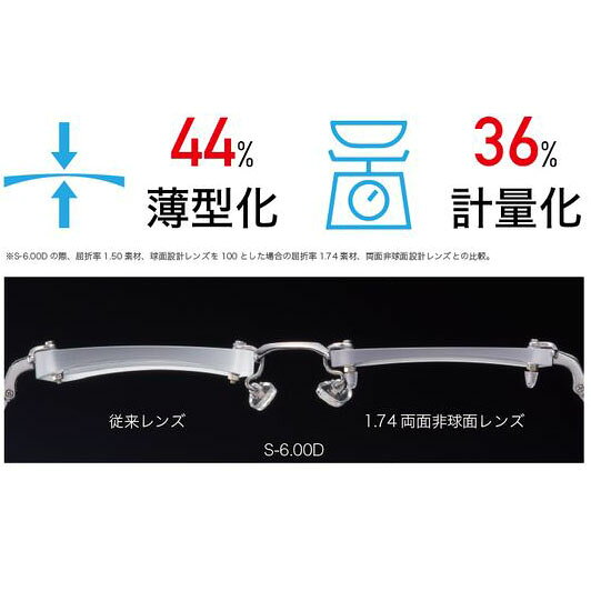 ゆがみの少ない人気レンズ 1.74超薄型両面非球面レンズ アサヒオプティカル 1.74両面非球面レンズ 単焦点 めがね 眼鏡 メガネ レンズ交換用 2枚1組 1本分 他店購入フレームOK 持ち込み可 持込可 「低ベースカーブ+両面非球面設計」により、薄型化・軽量化を実現 レンズ周辺部までクリアーな視野に!! 両面非球面設計は乱視が存在する際にその性能が十分に発揮されます。 球面度数と乱視度数に対しては歪曲収差を大きく抑え、中間度数においても広くクリアーな視野を確保できます。 フェースラインにも影響を与え、よりナチュラルな印象を与えます。 度数が強い方、目が小さく見えるのが嫌な方、フェイスラインの歪みが気になる方におすすめです。 メーカー:アサヒオプティカル 屈折率:1.74 設計:両面非球面 UVカット:標準仕様