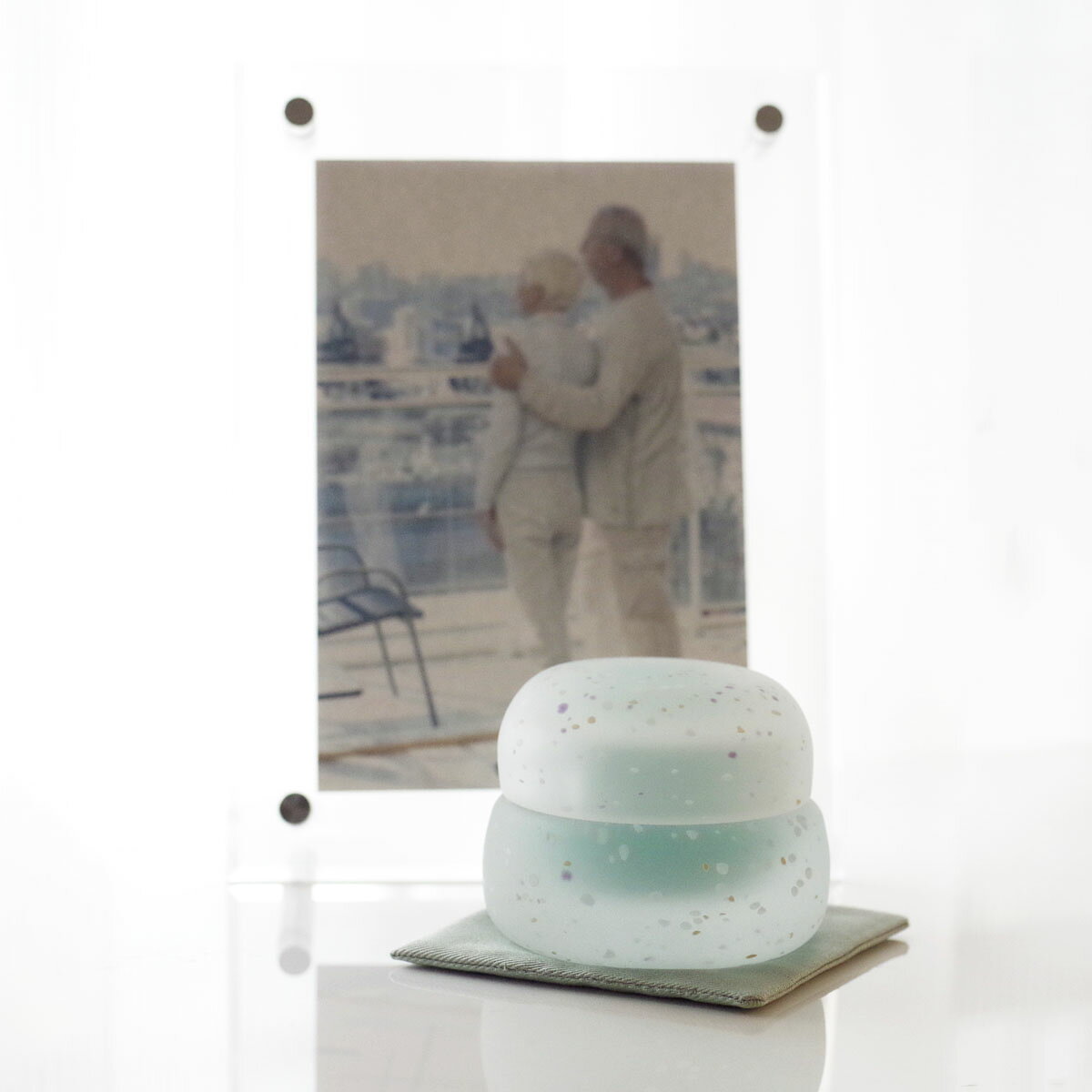 彩・Saiシリーズカラー新緑(グリーン系) 花がすみ(ホワイト系)さくら(ピンク系)ラベンダー(パープル系)ソラ(水色系)サイズ高さ54mm 直径70mm 間口36mm 材質ガラス 重量270g付属品専用桐箱、納骨用小袋 敷布(商品カラーと同カラー)商品説明 ガラス特有の透明感と優しい色、磨りガラスの落ち着いた風合い、丸いフォルムによる優しい印象のソウルプチポット。ロック機能付き。 2015年グッドデザイン賞受賞。
