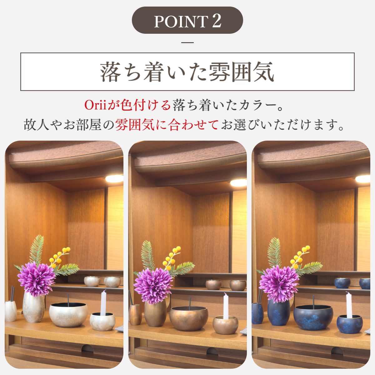 【オリビア エーデル 6点セット】 【商品説明】 ・富山県高岡市にて製造 ・コンパクトサイズ ・ラグジュアリーな空間をまとう ・アンティーク調で気品のあるデザイン ・火立、線香立、花立、仏器、湯呑み、線香立の6点セット (仏器は、ご飯をお供えする器、湯のみはお水やお茶をお供えする器になります。) ・ステンレス製の受皿付。 ・モメンタムファクトリー・Orii着色の3色展開 \PathinaBlack(パティナブラック)/ 【緑青×黒染】 黒イブシ染めを施したのち、薬品により化学変化させ緑青(ろくしょう)を浮かび上がらせる \RustSilver(ルストシルバー)/ 【錆×純銀メッキ】 ぬか焼きにより斑模様をつけ、模様が消えぬよう薄い純銀メッキを幾重にも重ねていく \SulfideBrown(サルファイドブラウン)/ 【硫化×斑紋】 薬品を用いて酸化させ、硫化を繰り返し、様々な模様、色彩を発色させる 【職人紹介】 ・モメンタムファクトリー・Orii(オリイ) 唯一無二の発色と質感 Oriiの生み出す無限の色 魔法のように浮かぶ模様 金属に、職人の手とイマジネーションで、千変万化の表情を描く独自の技法は、どこにもない、Oriiオリジナルの発色をもたらします 【詳細】 素材:真鍮 サイズ:花立 W49mm×H78mm 火立 W52mm×H32mm 香炉 W85mm×H44mm 茶湯器・仏器 W45mm×H26mm 線香立 W29mm×H45mm ※画像の色はブラウザや設定により、実物とは異なる場合があります。 ※職人がひとつ一つ手作業で着色するため模様のでかたなど異なります。