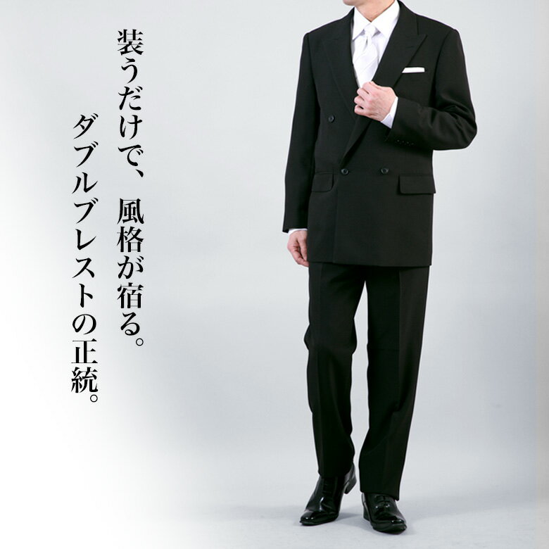 礼服 メンズ ダブル フォーマルスーツ 4つボタン ダブルブレスト ワンタック アジャスター付 洗えるスラックス 黒 ブラックスーツ オールシーズン 春夏秋冬 冠婚葬祭 結婚式 披露宴 喪服 葬儀 葬式 法事 当日出荷 即日発送 即納 翌日配達 テーラーバック付属 葬式 FW8200-10