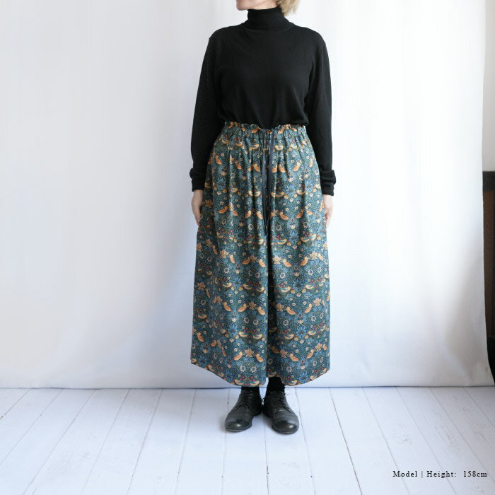 WINSOME Liberty ウィンサムリバティ ウィリアムモリス <STRAWBERRY THIEF いちご泥棒(S)>ロング キュロット コットンパンツ <BIBIANA-MSS> 31WSL-BIBIANA-MSS 脚長効果の高いパンツタイプが登場です。 ウイリアムモリスのいちご泥棒のコットン生地でまるでスカートみたいに見えるパンツを作りました。WINSOME Libertyオリジナルのタックとギャザーをたっぷりいれたウエストフリルの<BRUNA>スカートと、見ためはほとんど変わらないものの、実はパンツという<BIBIANA>パンツは、動きやすさも去ることながら、スカートより丈が5cmほど長くなっているのでサンダルにはもちろん、ハイカットの靴とあわせたときにもバランスよくまとまります。深くて安定感がある股上は、サルエルパンツほど深くないので自転車も乗れるし、年齢を問わず穿きやすい仕様です。ウエストやヒップ周りのサイズ感、ゴムとドローコードで微調整できる仕様や左右のポケットなど、ディテールはスカートバージョンの<BRUNA>と同じですが、こちらのパンツタイプの<BIBIANA>は着丈が少し長い分、脚長効果が高い感じです。 リバティのいちご泥棒より大きく原版より小さめの柄。 ウィリアムモリスはリバティプリントの定番柄<Strawberry Thief(いちご泥棒)>のデザイナー。こちらの柄は最も一般的な原版モチーフのモリスのいちご泥棒よりモチーフが少し小さめのタイプ。リバティのいちご泥棒が最も小さく縮小されたタイプで、こちらはちょうど中間サイズのモチーフです。テラコッタ色で描かれた鳥がアンティークっぽい雰囲気を醸し出します。 ●BLUE / インディゴブルーのベースカラーにブルーの同系で描かれた絵柄。 ●MOSS / 黒色ベースにグリーンなどアースカラーでまとめた絵柄。 ほどよくしっかりしたUSAコットン。 moda fabricsのUSAコットン100%です。ほどよいハリのあるシーチングコットンは、透け感もほとんどなく一年を通じて着用可能です。リバティのタナローンやmoda fabricsのローン生地に比べると糸の番手が太いので生地がしっかりしていて、少しカジュアルな印象のある質感の生地です。 総ゴムとドローコードのW仕様。 総ゴムのウエストには、さらにドローコードがついているのでサイズ調整が可能です。ゴムは替え口があるので取り出して調整も出来ます。ゴムを入れない状態でのウエストは100cmくらいあるので、妊婦さんだって、どんな体型の方でも大丈夫だと思います。 いくつになっても愛嬌のある可愛さを大切にしたい。 WINSOMEとは「愛らしい・愛嬌のある」という意味。WINSOME Libertyウィンサムリバティはリバティやウィリアムモリスなど伝統の生地を用いて、神戸のアトリエにてハンドメイドで仕立てています。いくつになってもWINSOMEを大切にしたいすべての女性へ、長く時をともにできる心地よいアイテムを提案します。 サイズ選びと製品についてのアドバイス 158cm 9号体型でウエストもヒップもゆったりした穿き心地です。総丈85cmなので、フラット靴なら足首が少し見えるくらい、ハイカットのスニーカーを合わせてもバランスよく穿けて、上品さのある雰囲気にまとまります。ウエストはギャザーだけでなくタックも入っているので下腹が膨らみにくくて着膨れを防止してくれます。透け感はほぼ無いので、素足で穿いても心地よいです。見た目はほとんどスカートですが、足が分かれたパンツなので自転車も乗れて動きやすく重宝します。