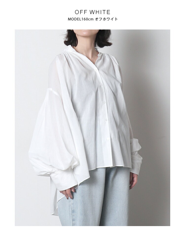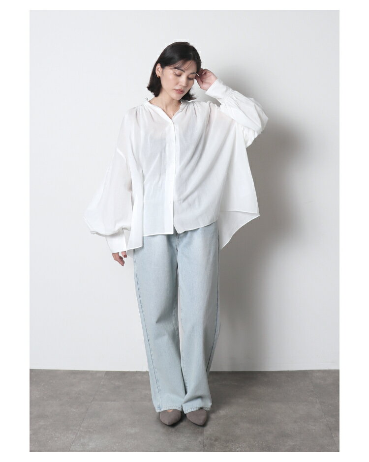 bottoms:ストレートデニムパンツ bottoms:マットピーチスキンナロースカート bag:ミニショルダーバッグ bottoms:ミラノリブニットスカート bottoms:リラックスコクーンデニム ITEM INFORMATION 表記サイズ Free モデル身長 160cm 実寸 着丈:前68cm後78cm 肩幅:49cm 身幅:100cm 袖幅:39.5cm 袖丈:58.5cm 裾幅:100cm >>> サイズガイド ※サイズは測り方により誤差が出る場合がございます。 ※同商品でも生産の過程で多少の個体差が生じる場合がございます。 各採寸箇所は実寸(平置き)で【約-2cm~+2cm】程度は誤差の許容範囲とさせて頂いておりますので、予めご了承ください。 素材 綿100% 透け感 透け感あり 生地の厚さ 薄手 取り扱い・洗濯 ●手洗いでのお洗濯をおすすめします。 ●洗濯ネットを使用し、押し洗いをしてください。 ●アイロンはあて布を使用してください。 ●塩素系及び酸素系漂白剤のご使用はお避け下さい。 ●タンブラー乾燥機のご使用はお避け下さい。 ●この商品は強い日光及び強い照明を長時間受けると変色する場合がありますので、ご着用及び保管の際にはご注意ください。 ●染色の性質上、色落ちする可能性がありますので、淡色系の衣服との重ね合わせはご注意ください。 ●濃色は色落ちする場合がありますので、他のものと分けて洗濯するようお願いします。 ●洗濯後は形をととのえてすぐに干してください。移染する場合がありますので他の製品と分けて保管してください。 ※詳しくは商品の洗濯ネームをご確認ください。 注意事項 ●当商品は機械による生産の過程上、「生地を織る際の糸の継ぎ目」や多少の「ほつれ」が生じる場合がございます。 また、同商品でも形や縫製仕上がり具合には個体差が生じる場合がございますので、予めご了承の上ご注文ください。 ●同じ商品でも生産時期により、生地やカラーに多少の誤差が生じる場合もございます。予めご了承の上ご注文ください。 ●個別ビニール袋に入れ、たたんだ状態で発送させていただくため、お届時には皺やたたみ跡が強く残っている場合がございます。不良品の対象とはなりませんので予めご了承の上ご注文ください。洗濯タグ・品質表示に従ってアイロンまたはスチームアイロンをかけていただく事をおすすめいたします。 ●掲載画像の商品の色味は、撮影場所や光の当たり具合などにより色味が異なって見える場合がございます。また、お客様のお使いのPC・スマートフォン等のモニター環境などにより色味が異なって見える場合がございます。