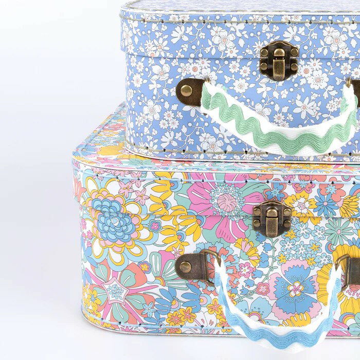 Meri Meri x Liberty Suitcases 284631 リバティの華やかなフローラルプリントが目を引く、サイズ違いのスーツケース2個セットです。 丈夫な厚紙素材を使用し、ステッチ仕上げで高級感のあるデザインに仕上げました。 小さいスーツケースは、大きいスーツケースの中に収納可能です。 ハンドルにはナチュラルコットンのウェビングテープを使用し、リックラック(波型の飾りテープ)でアクセントをプラス。 内側はストライプ柄で、細部までこだわりのあるつくりです。 クラシカルな真ちゅう色の留め具付きで、実用性とデザイン性を兼ね備えたアイテム。 インテリア収納としてはもちろん、ギフトにもおすすめです。 スーツケース2個(大小 各1個) サイズ(センチ) 大:約29.2 × 24.1 × 12.1 小:約23.5 × 18.4 × 10.2