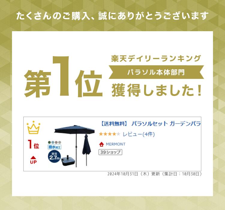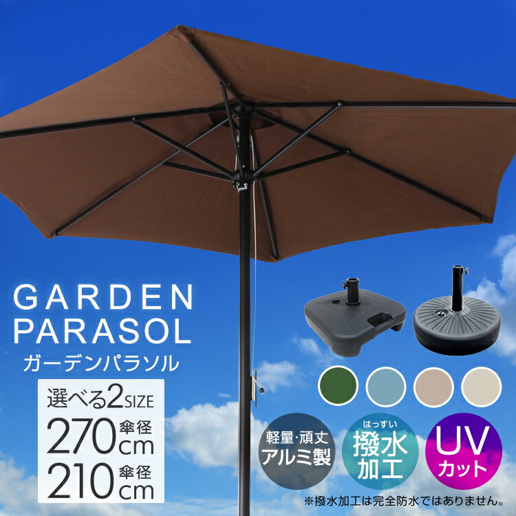 バーベキューにピクニックにビアガーデンと晴れた日には欠かせないアイテム! 日差しの向きにあわせて傘の角度調整ができる便利なガーデンパラソルです。 日差しに合わせて角度を変えられるチルト機能を搭載しているので直射日光対策にぴったり。 ボタンを押すだけのカンタン操作なので、角度を調整しやすくとっても便利です。 パラソルの開閉には、普通の傘とは違いハンドル式を採用。 ハンドルをクルクルと回すだけで開閉できるので、これほど大きなパラソルでも女性一人で簡単に開閉できます。 UVカットが施された270cmという大きなパラソルが強い日差しから守ってくれるので、直射日光を気にせず快適にガーデンライフを楽しんでいただけます! 撥水加工も施してあるので、急な雨にも安心です。 アルミ製支柱なので木製パラソルと比較して軽量! ご自宅のお庭、バルコニー、テラスや店舗先のカフェペースなどにお使いいただけます。 河原でのバーベキュー、夏場にお子様のプール遊びの時にご使用になっているお客様もいらっしゃいますよ♪ 商 品 詳 細 カラー ブラウン グリーン ミスティサボン グレージュ サンドグレー ネイビー 機能 ・ベンチレーション ・UVカット ・撥水加工 ・チルト機能付き(270cmタイプ) サイズ 【210cm】:(約)φ210cm×H220cm 【270cm】:(約)φ270cm×H240cm ※ポールの直径:(約)3.8cm 収納時サイズ 【210cm】:(約)110cm×25cm 【270cm】:(約)140cm×25cm 重量 【210cm】:(約)3.0kg 【270cm】:(約)4.6kg 素材 ポリエステル、スチール、アルミ他 保証期間 30日間 ※商品到着後30日以内の初期不良・破損のみご対応させていただきます。 注意事項 ・傘生地には撥水加工をしておりますが、完全防水ではありません。 ・風や雨が強い日の使用は危険ですので、ご使用しないでください。パラソルやベースを地面に固定しても突風や瞬間的な豪雨などでパラソルが破損する場合がございます。そのような自然現象による破損につきましては保証の対象外となりますのでご注意ください。 ・商品は、モニターによって色合いが異なって見える場合があります。 ・仕様・デザインは改良のため予告なく変更することがあります。 送料 無料 ※北海道・沖縄・離島等、一部地域は別途中途料がかかります。 備考 ・配達地域や交通事情等により、希望配達日時にお届けできない場合がございます。あらかじめご了承ください。 ▼Keyword 200cm 210cm 220cm 240cm 270cm 25cm 140cm 110cm 3.8cm 虫除け 蚊帳 公園 遮光 日差し 可愛い 海 花見 お花見 運動会 体育祭 庭 BBQ 憩い 休憩 屋外 スペース 防水 撥水 ポリエステル スチール アルミ ポール サビ 水 汚れ 強い 丈夫 長持ち かわいい おしゃれ お洒落 映え 撮影 写真 カメラ スポット ガーデンパラソル パラソル アルミ パラソル ビーチパラソル 傘 ガーデン オープンカフェ ガーデニング カーデンファニチャー 庭 テラス ベランダ アウトドア 日除けテント 日よけ ビーチテント ワンタッチテント 一人で 簡単 組み立て 設置 キャンプ ソロキャンプ ペアキャンプ グループキャンプ ファミリーキャンプ グランピング ビーチ キャンプ 日傘 折りたたみ 日よけ 暑さ対策 熱中症対策 猛暑 冷感 涼しい ベースブラック 物干しスタンド レジャーマット テーブル セット 紫外線 UV 紫外線カット 紫外線対策 UVカット テント 重り 錘 チルト 傾き 傾く 調整 調節 角度 テラス キッチンカー 映える 展示 ディスプレイ 便利 必需品 かっこいい 格好良い 最先端 トレンド 流行 可愛い かわいい お洒落 おしゃれ 春 夏 秋 冬 オールシーズン 倉庫 工場 整備 設備 工事 現場 農業 林業 漁業 畜産 酪農 会社 企業 オフィス 事務所 カフェ 飲食店 レストラン バル ダイニング イタリアン フレンチ 居酒屋 料理 バー BAR キッチン 店舗 幼稚園 保育園 託児所 学校 ホテル 病院 老人ホーム 介護 医療 看護 施設 養護施設 デイサービス 最強 評価 誕生日 父の日ギフト 父の日 プレゼント 母の日ギフト 母の日 プレゼント 実用的 母の日ギフト 花以外 母の日 敬老の日 子供の日 こどもの日 勤労感謝の日 クリスマス クリスマスプレゼント バレンタイン バレンタインギフト ホワイトデー ホワイトデーギフト 内祝 内祝い お祝い返し ウェディングギフト ブライダルギフト 引き出物 引出物 入園 入学 卒園 卒業 就職 快気 開店 二次会 披露宴 お祝い 御祝 結婚式 結婚祝い 出産祝い 初節句 七五三 成人式 昇進 新築祝い 引っ越し祝い 引越し祝い 開店祝い 退職祝い 快気祝い 還暦祝い 古稀祝い 喜寿祝い 傘寿祝い 米寿祝い 卒寿祝い 白寿祝い 長寿祝い 金婚式 銀婚式 ダイヤモンド婚式 結婚記念日 ギフト ギフトセット 詰め合わせ 贈答品 お返し お礼 御礼 お見舞い お見舞御礼 謝礼 お餞別 引越しご挨拶 記念日 定年退職記念品 ゴルフコンペ コンペ景品 ビンゴ 大会 忘年会 一発芸 出し物 新年会 ゲーム 景品 賞品 粗品 お中元 御中元 お歳暮 御歳暮 年賀 残暑見舞い 年始挨拶 正月 宴会 お盆 ハロウィーン ハロウィン 大晦日 大みそか コスパ タイパ コストパフ