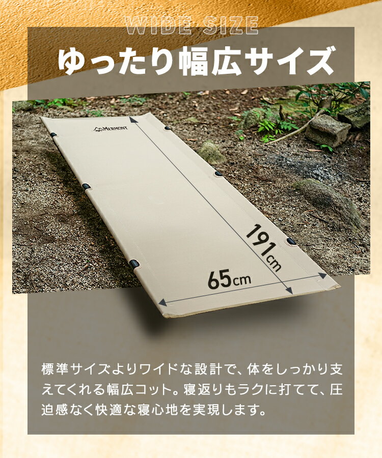 地面に触れず快眠!アウトドアで大活躍のフォールディングコット 地面の凹凸や湿気を気にせず、まるで自宅のベッドのような快適な寝心地を実現! またオプションのエアーマットは自動膨張式で簡単セッティング! 長時間寝ても疲れにくい高反発ウレタンだから快適に眠ることができます。 アウトドア・キャンプでの使用にはもちろん、ツーリング、車中宿泊などさまざまなシーンでご利用いただけます。 軽量・コンパクトなので地震や災害時の防災用品としてもオススメです。 \おすすめポイント/ ・寝返りや姿勢の変化にも対応できる幅広ワイド設計でゆったり快眠 ・2段階の高さ調整 ・ベッド・ベンチ・荷物置きとシーンに合わせて使い分けできる3WAY ・使わないときは折りたたんで収納袋にサッと収納!持ち運びにも便利な軽量設計 ・水にも強い撥水性 ・キャンプだけでなく、防災用の備えや来客時の簡易ベッドとしても活躍 商 品 詳 細 内容 コット本体、収納袋 オプションでエアマット カラー 【コットカラー】 サンドベージュ、ブラック 【エアマットカラー】 ネイビー、グリーン、コヨーテ サイズ(約) 【コット】 191×65×38cm 【エアマット】 ・5cmタイプ サイズ:縦198cm×横65cm×厚さ10cm 収納サイズ:65×19cm ・10cmタイプ サイズ:縦198cm×横65cm×厚さ10cm 収納サイズ:65×22cm 重量(約) 【コット】 2.8kg 【エアマット】 5cm:2kg 10cm:3kg 耐荷重(約) 【コット】 150kg 素材 オックスフォード900D(シート)アルミニウム(脚) 保証期間 30日間 ※商品到着後30日以内の初期不良・破損のみご対応させていただきます。 注意事項 ・折りたたみをするときに指を挟まないように注意して下さい。 ・膨らみが足りない時は直接息を吹き込んで空気を入れてください。 ・膨らませすぎるとエアマットが破損する可能性がございますのでご注意ください。 ・入荷時期により、多少色味が異なる場合がございます。初期不良対象外となりますのでご了承下さい。 ・写真と実物は多少異なる場合がございます。あらかじめご了承下さい。 配送について 送料 無料 ※北海道・沖縄・離島等、一部地域は別途中途料がかかります。 備考 ・配達地域や交通事情等により、希望配達日時にお届けできない場合がございます。あらかじめご了承ください。 ▼Keyword コット キャンプ 3WAY 2WAY ハイコット ローコット コットカバー 高さ調節 ハイ ロー 切替 ワイド 幅広 68cm 耐荷重150kg 軽量 コンパクト A7075 超々ジュラルミン レバー式 簡単組立 きしまない 静音設計 キャンプコット アウトドアコット キャンピングベッド アウトドア ベッド 折りたたみ ベンチ 椅子 荷物置き ソロキャンプ ファミリーキャンプ ツーリング 防災 来客用 撥水 収納袋付き ブラック サンド 犬 猫 ペット 開放感 メッシュ ビーチ 野外フェス 虫 防虫 侵入 防ぐ 防止 ファスナー ジッパー チャック 開閉 縫い目 シームテープ グラスファイバー フレーム 突風 ペグ ロープ 固定 UPF50 シルバーコーティング 暑さ 軽減 熱中症対策 砂 埃 ホコリ ゴミ サンドガード 収納 収納ケース キャリーバッグ ベンチレーション 遮光 遮熱 折り畳み 体 冷やす 冷やさない 凍える 凍死 凍傷 壊死 低体温 対策 バーベキュー ビバーク 標高 頂上 登頂 ケルン 遭難 救助 事故 災害 防災 避難 避難所 宿泊 外泊 寝泊り 素泊まり 旅 ツーリング トレッキング ワンダーホーゲル 秋山 紅葉 冬山 寒冷地 ロッジ 漁 猟 狩り 見張り 偵察 探偵 尾行 張り込み 見回り おウチ 家 庭 普段使い 毎日 自宅 快眠 安眠 睡眠の質 スリーピングギア グランピング ベランピング 花火 花火大会 夏祭り 祭り 夏休 こどもの日 母の日 父の日 ハロウィーン ハロウィン 結婚 内祝い 快気祝い 出産 還暦 卒業 入学 入園 卒園 式 庭 公園 運動会 文化祭 部活 体育祭 体育館 バザー 企業 会社 コミケ コミックマーケット 店 学校 大学 高校 サウナ ソロキャンプ ソロキャン デュオキャンプ グループキャンプ ファミリーキャンプ スリム ロースタイル ミドルスタイル ローテーブル 耐荷重 サイズ 重い 軽い 重量 軽量 持ち運び 運搬 楽 ラクラク 楽しい 簡単 カンタン 構造 コンパクト 省スペース 車 トランク 後部座席 助手席 保管 載せる 小さい 大きい 幅広 たくさん 沢山 料理 食器 調理器具 コーヒー ミル コンロ 食材 皿 箸 スプーン フォーク 飯ごう 焚火 高さ 調整 調節 ハイスタイル 高い 低い 防水 加工 水 汚れ 雨 雪 風 台風 雹 霜 強い サビ 錆 掃除 清掃 手入 保管 保存 長持ち 耐久性 組み立て 簡単 カンタン 年中 シーン 季節 中 外 屋外 屋内 熱 防災 車中泊 登山 リメイク シート 高さ調節 セット レイアウト キャンプサイト タフ 頑丈 おもり 重り 錘 到着 早い 速い こだわり 拘り 個性 コスパ タイパ コストパフォーマンス タイムパフォーマンス 時短 徹夜 並ぶ 整理券 店 イベント 来場 ライブ 限定販売 限定発売 コラボ アイテム 福袋 初売り セール デパート 開店 店頭 転売 発売 列 座り込み 路上 待つ 行列 必需品 便利 メンズ レディース 男 女 年寄 年配 子ども クリス