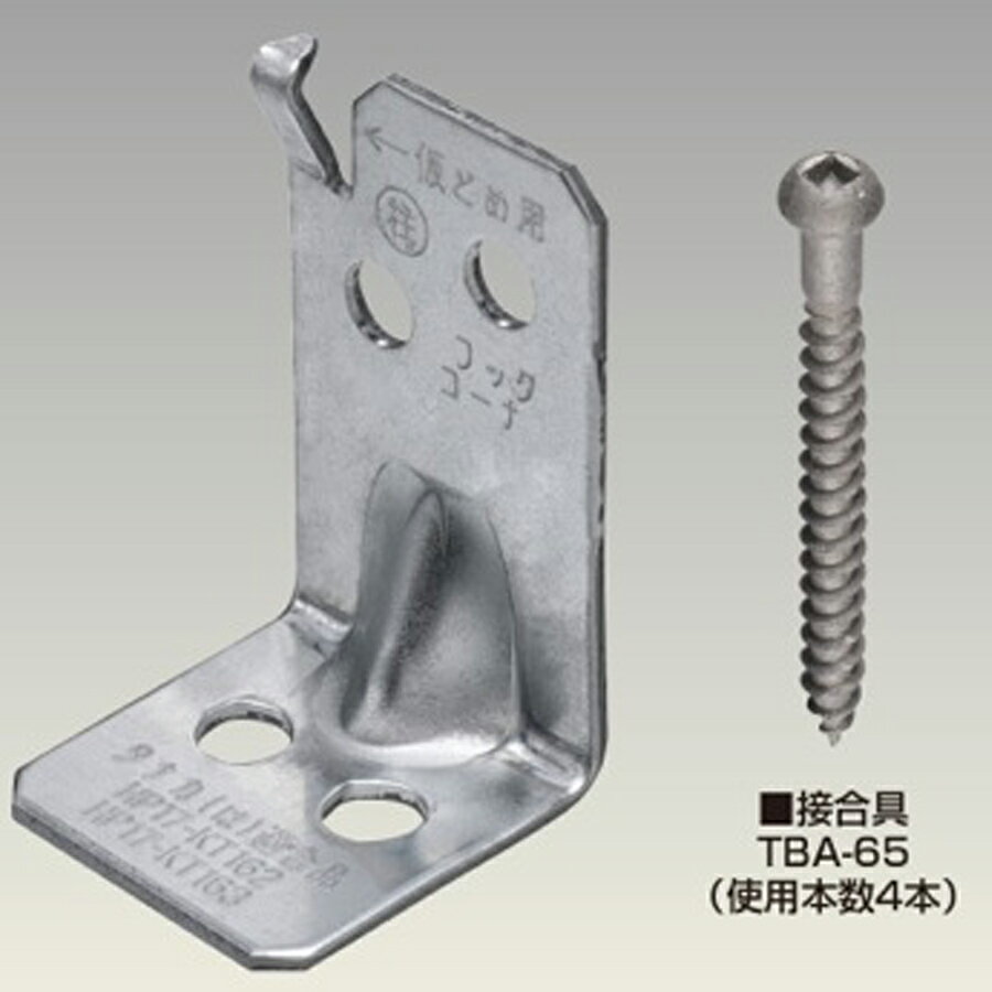 柱と横架材の接合に使用します。 横架材の上に取り付けため、外壁の施工が容易にできます。 4本のビスで施工可能なため、作業の効率化が図れます。 巾30mm、高さ50mm、板厚1.6mmと製品が小さいため、納まりよく施工できます。 仮どめ用のツメで製品を柱に固定することで、高所作業が楽になります。 ※仮どめ用のツメを使用しない場合でも、構造上の耐力低下はありません。 ハウスプラス確認審査(株)による接合部性能試験済み商品です。 材質JIS G 3302(溶融亜鉛めっき鋼板及び鋼帯)SGHC SGCC表面処理溶融亜鉛めっき鋼板(Z27)付属品TBA-65×4本/個