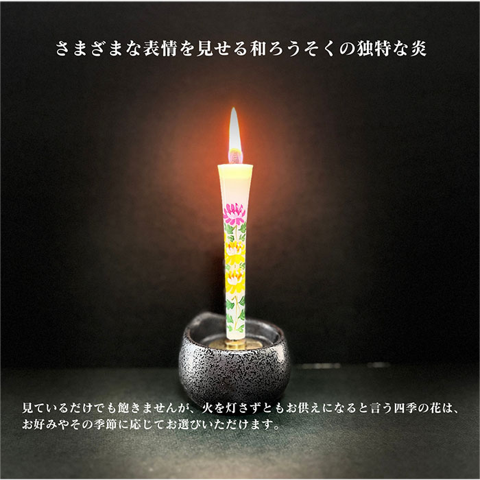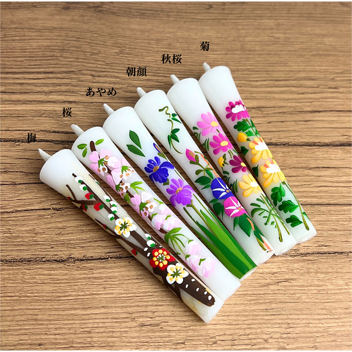 細密な手描きの絵ローソクです。 和ろうそくの原料は、植物の「ハゼの実の油」の木ろうを使用し、芯はい草のズイの灯芯を使用しております。 火をともさなくてもお供えになる花絵ろうそく さまざまな表情を見せる和ろうそくの独特な炎。 見ているだけでも飽きませんが、火を灯さずともお供えになると言う四季の花は、お好みやその季節に応じてお選びいただけます。 またお仏壇のお供えだけでなく、おしゃれなインテリアとして、風情を味わう照明として、多くのシーンで楽しまれています。 風にも強く、さまざまな表情を見せる炎は、和ろうそく特有です。 描かれた花はこの灯りを一層引き立てます。 ひとつとして同じものがない花です 花は1本1本に丁寧に手描きされ、箱の中に並びます。 ろうそく、絵ともに手作りなので、ひとつとして同じものはありません。 日常は火を付けずにお仏壇に供えて頂ければ、万一お花が枯れた時でもご先祖様に対して失礼にならないという意味合いがあります。 また、ご先祖様の大切な日(お盆・お彼岸・月命日等)にこそ火を灯して頂ければ、とても功徳になると言われています。 絵柄の選び方は自由です。季節に関係なく生前お好きであった花の絵柄がございましたら、その柄をお選び頂いてもけっこうですし、一番新しい仏様のご命日のある月にあわせて絵柄をお選び頂いても結構です。 元来絵蝋燭は、東北地方や北陸地方のような寒い地域でお仏壇のお花をお供えする代わりとして発達してきました。 最近では、和ロウソク特有の炎の美しさなどから、日本舞踊、お茶席、料亭等の和を演出する灯りとして、また、インテリアやお土産物として全国的に需要が増えてきています。 どなたにも喜ばれるご進物 季節のたよりに、ご挨拶に、ご供養に… どなたにも喜ばれるご進物として最適で、自信を持ってお勧めできるお品です。 ■商品詳細 ◎内容量 6本入 ◎サイズ 長さ9cm ◎セット内容 梅 桜 あやめ 朝顔 秋桜 菊 ■「のし」「包装」「ご挨拶状」につきまして ご進物用に、熨斗(のし)紙や包装、表書き、名入れに対応いたします。 また、ご挨拶状の作成を無料で承ります。 お悔やみのご挨拶状を、送り主様のお名前と共にお品物に添えてお届けします。 下記のご希望の文面をお選びになり、ご注文時にお知らせ下さい。 まごころこめてご用意いたします。 文例など、詳細はこちらをご覧ください。 ■お届け ご入金確認後(代引きは受注・在庫確認後)、2日〜3日以内に発送予定です。 ■備考 ・本商品の詳細については、どうぞお気軽にお問い合わせください。 ・お仏壇の常備品としてもおすすめ致します。