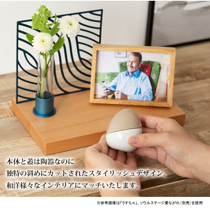 従来の陶器製の骨壺とは違う丸みを帯びた温もりが伝わるやさしいたまご型フォルムのソウルプチポット。 大切な人の好きだった色、インテリアにマッチする色等、想いに合わせて 6種のカラーアクセントが大切な人をつつみます。 本体と蓋は陶器なのに独特の斜めにカットされたスタイリッシュデザイン。 和洋様々なインテリアにマッチいたします。 陶器の上蓋を固定する滑り止めシールと、内蓋用蓋止めシールを付属。 ご遺骨を大切に守ります。 ご遺骨を紙に包んだり直接お納めするのに抵抗がある方の声におこたえして、大切な方を守る専用のインナーポーチ(遺骨袋)をご用意しました。 ■商品詳細 ◎材質 陶器 ◎サイズ 高さ70mm×直径53mm×口径25mm ◎重量 96g ◎内容量 45cc ◎セット内容 納骨用巾着、滑り止めシール 4枚、蓋止めシール 4枚 ◎色 もも(1231) みずいろ(1232) うすちゃ(1233) きみどり(1234) あかむらさき(1235) こんいろ(1236) ■遺骨・遺灰の納め方 フタを開けご遺灰を直接、または付属の遺骨袋や紙などに包み納めください。包み紙は付属しておりません、お好みの紙(和紙や千代紙など)をご用意ください。 ■お届け ご入金確認後(代引きは受注・在庫確認後)、即納可能です。(在庫切れの場合、営業日で数日内に発送いたします) ■備考 ・1点1点手作業で製作をしています、個体差がありますこと、あらかじめご了承下さい。 ・ご遺骨はお客様の手で大切にお納め下さい。 ・本商品の詳細については、どうぞお気軽にお問い合わせください。 ・ご遺骨などを扱うとてもデリケートなお品につきまして、お伝えしたいことをまとめました。 ・4582536510575, 4582536510582, 4582536510599, 4582536510605, 4582536510612, 4582536510629ご遺骨などを扱うとてもデリケートなお品につきまして、お伝えしたいことをまとめました。