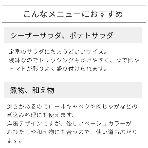 商品名 アンジュ5.0浅鉢 商品詳細 【サイズ】16.7cm×16.5m×高さ4.6cm(※全て外寸です) 【重さ】276g (※サイズと重さは商品ごとに誤差がございます) 【材質】磁器 【質感】ツルツル ※日本製(美濃焼) ※電子レンジ、食器洗浄機:可 ※ご確認下さい※ ●こちらは 【アウトレット込み商品】 です。 ※ご購入の際には必ずこちらのご利用ガイドをご確認下さい。 ※アンジュシリーズは、色ムラ、ピンホール、釉薬の結晶のかたまりが小さな点となって表面に出てくる現象、形状に沿って釉薬が薄い箇所がある場合がございます。どちらも安全性に問題はございません。 また、色味に個体差がございます。状態をお選び頂くことや、複数枚ご注文頂いた場合に色を揃えることはできません。 これらは良品の範囲内となりますので、これらが理由の返品・交換は、お受け致しかねます。あらかじめご了承下さいませ。 ※モニターによって色あいが異なって見える事があります。 ※商品画像に写っている小物・背景の商品は撮影用のため付属しません。 商品の特徴 ◆ふんわり、やさしいデザイン 渕がふんわり、花びらのよう。 なめらかでゆったりとした形とやさしいクリーム色で、癒しのテーブルコーデに。 ランチにディナーに、温もりを演出してくれます。 ◆スイーツや取り皿に ふんわりかわいい、約16.7cmの浅めのボウル。 サラダや煮物が彩りよく見えます。 ◆おすすめの使い方 【シーザーサラダ、ポテトサラダ】 定番のサラダにちょうどいいサイズ。 浅鉢なのでドレッシングもかけやすく、ゆで卵やトマトが彩りよく盛り付けられます。 【煮物、和え物】 深さがあるのでロールキャベツや肉じゃがなどの煮込み料理にも使えます。 洋風デザインですが、優しいベージュカラーがおひたしや和え物にも合うので、使い道も広がります。 関連ワード 食器 おしゃれ 中鉢 アンジュ5.0浅鉢 煮物鉢 美濃焼 中鉢 ボウル 花型 花形 アウトレット カフェ風 電子レンジ対応 食洗機対応 日本製 カフェ食器 おうちcafe おうちカフェ お家cafe お家カフェ シンプル ベージュ 茶色 プレゼント 母の日 父の日 敬老の日 新生活 一人暮らし 誕生日祝い 結婚祝い 結婚記念日 出産祝い 新築祝い 引っ越し祝い 開店祝い 入学祝い 卒業祝い 贈答品 記念品 ホームパーティー おしゃれ かわいい 可愛い お洒落 キッチン用品 キッチン雑貨 キッチンアイテム 台所用品 エムズホームスタイル mhome style おしゃれ食器の通販Mhomestyle ナチュラルな食卓のアイテム※クリックで大きい画像が開きます ※クリックで大きい画像が開きます 4.5皿 5.0浅鉢 6.3深皿 8.0皿 カップ160cc 2.5小鉢 5.0深鉢 楕円鉢