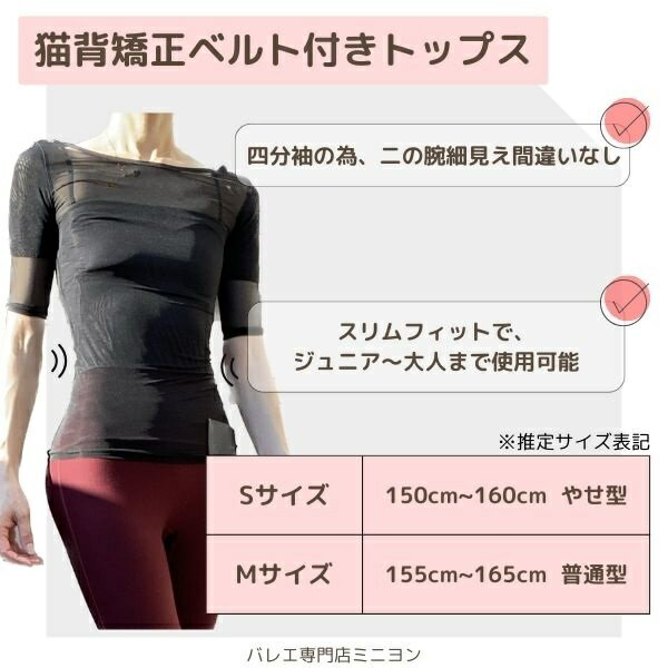 【ミニヨンハイクラスコレクション】 ミニヨン独自開発”TADASU-TOPS/タダス-トップス”満を持して発売開始!!! バレエの美しい姿勢はどんな感じ? 写真で見るのと自分がやるのとでは大違い! 大人から始めた方や練習量の少ないお子様は正しいバレエの姿勢を言葉だけでは学ぶことができません。。。 そ・こ・で ミニヨンはレッスン中ずっと背中や肩、二の腕の正しい位置を意識できるトップスを開発いたしました。 その名も→→→【TADASU タダス トップス】 特にバーレッスンだけのご着用を推奨いたします。センターからは脱いで正しい背中で踊れるか確認してみてください。 猫背矯正ベルトはよく売られていますが、華奢な体型の方には矯正力が弱く、付けている意味がないものばかり。 このミニヨン開発のトップスは、肩甲骨を下げ肩を下ろし、背中を立て、胸を広げることを重点においたウエアです。 特にバレエや社交ダンスの方の姿勢改善におすすめです! ■■■ このトップスの良さ ■■■ 【1】猫背や巻肩、二の腕が落ちるというバレエではNGの姿勢を正す意識のできるトップス 【2】レッスン中着ていただけるシンプルでコーディネートしやすい美しいスリムフィットデザイン 【3】市販品とは違う背中の2重!強圧平ゴムゴムバンド 【4】二の腕を細く見せ、かつ腕が落ちる意識のできる4分袖 【5】お家でネットに入れてお洗濯可能(漂白剤や乾燥機、網なしでのお洗濯は不可!) ■■■ こんな方は着られません ■■■ *華奢~普通体型の方に合わせて規格しました。バストが大きい方、肩幅が広い方、身長がかなり高い方はご着用できません。 *着る時、脱ぐ時、少し窮屈で大変です。早くに着替えたい方はご遠慮ください。 *メッシュ生地なので、爪やアクセサリーに引っ掛けやすいです。 *身長150~160cmの中学生、高校生、大人向けに作りました。 *バレエの美しい背中や、デコルテ、肩を意識して改善を希望する方向けのウエアです。きつい着心地がお嫌いな方はご遠慮ください。 *現在はSサイズとMサイズのみのご用意しかございません。 カラー ●ブラック(黒の無地) サイズ ●Sサイズ(着丈:約57cm 身幅:約27cm 袖丈:約26cm 肩幅:約33cm)* Mサイズ(着丈:約60cm 身幅:約30cm 袖丈:約26cm 肩幅:約36cm) 素材 ●ナイロン76%+ポリウレタン24% 生産国 ●韓国製 お洗濯 ●洗濯ネットに必ずいれてお洗濯してください。(漂白、乾燥機はNGです) ブランド ●ミニヨンハイクラスコレクション 注意点 ●ネコポスで1枚のみ発送可能です。返品交換は可能ですが、ご試着時に商品に不具合の出たものは新品未使用品とみなせずお断りいたします。あえて細身に作られているトップスです。ご注意ください。