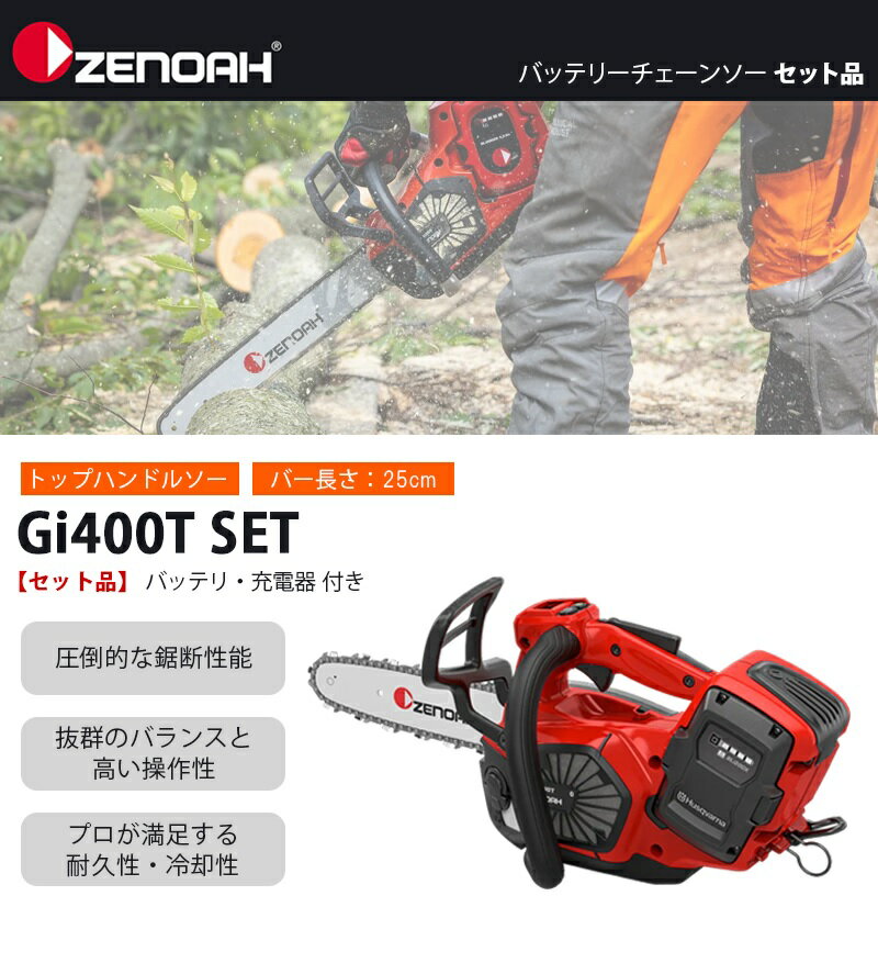 【バッテリー+1キャンペーン】ゼノア(Zenoah) バッテリーチェンソー トップハンドルソー セット品 (充電器QC330ZR + バッテリー40-B220X 付き) 【Gi400T SET (970730210)】