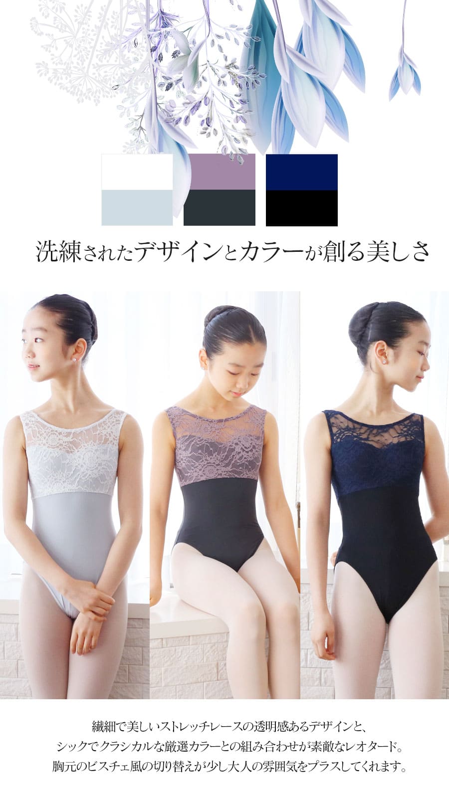毎日のレッスンに彩りを。 繊細で美しいストレッチレースの透明感あるデザインと、身体のラインを美しく魅せる抜群のシルエット、動きやすく身体に馴染むフィット感などすべてにこだわったレオタードです。 胸元のビスチェ風の切り替えが大人っぽく美しい雰囲気に仕上げてくれます。 伸びの良いストレッチレースは人気のくすみパープルや、透明感のあるホワイト、ベーシックで上品なネイビーをチョイスし、ボディはレースの美しさを最大限に引き出す、落ち着いたトーンの厳選したカラーを合わせました。 小さなお子様からジュニアまで、素敵に着こなせる一枚です。 商品カテゴリ: バレエ レオタード 子供 子ども キッズ ジュニア 子供レオタード バレエレオタード 練習着 バレエ用品 オーディション アンシェヌマン ワークショップ コンクール 大人 女の子 シンプル スタイリッシュ毎日のレッスンに彩りを。 繊細で美しいストレッチレースの透明感あるデザインと、身体のラインを美しく魅せる抜群のシルエット、動きやすく身体に馴染むフィット感などすべてにこだわったレオタードです。 胸元のレディなビスチェ風の切り替えが大人っぽく美しい雰囲気に仕上げてくれます。 伸びの良いストレッチレースは人気のくすみパープルや、透明感のあるホワイト、ベーシックで上品なネイビーをチョイスし、ボディはレースの美しさを最大限に引き出す、落ち着いたトーンの厳選したカラーを合わせました。 小さなお子様からジュニアまで、素敵に着こなせる一枚です。 -------------------- <モデル> 155cm(Lサイズ着用) <サイズ> 【裏地あり/ハイレグタイプ】 Sサイズ(110〜125cm) Mサイズ(125〜140cm) Lサイズ(140〜155cm) XLサイズ(155〜165cm) <素材> ボディ本体:ナイロン83%、ポリウレタン17% レース部分:ナイロン90%、ポリウレタン10% ●ネイビー×ワイン、ブラック×ベビーピンクのみ ボディ本体:ポリエステル80%、ポリウレタン20% レース部分:ナイロン90%、ポリウレタン10% ※洗濯は手洗いをお勧めします。洗濯機の場合は、洗濯ネットをご使用ください。 ※長時間の浸漬や濡れたままの放置は避け、洗濯後はすばやく干してください。 ※タンブラー乾燥はお避けください。 商品カテゴリ:バレエ レオタード 子供 キッズ ジュニア レディース ストレッチレース レース アンティーク クラシカル コンクール 伸縮 伸びる 動きやすい 可愛い キレイ 綺麗 バレエ用品 肩ひも ノースリーブ バレエ レオタード 子供 子ども キッズ ジュニア 子供レオタード バレエレオタード 練習着 バレエ用品 オーディション アンシェヌマン ワークショップ コンクール 大人 女の子 シンプル スタイリッシュ ●エレノア キッズ・ジュニア レディース