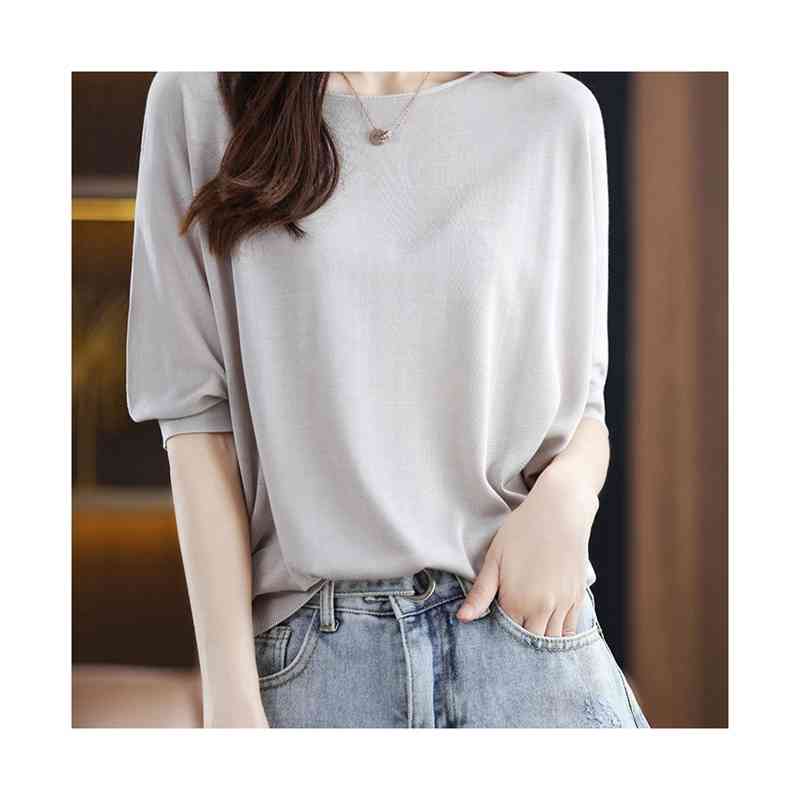 送料無料 半袖 ニットブラウス 夏 Tシャツ サマーニット 大きいサイズ トップス 母親 きれいめ 無地 ブルー ブラック レディース