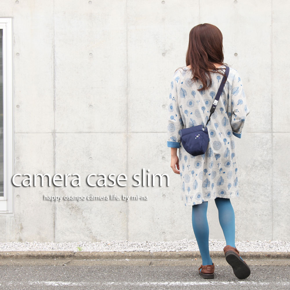 【当店のご紹介】mi-na (ミーナ)は、カメラ女子 のための カメラストラップ カメラケース カメラバッグ の専門店です。デジタル一眼レフカメラ、ミラーレス一眼カメラ 用の おしゃれで かわいい グッズを多数取り揃えています。カメラのお洋服スリム/ネイビー 帆布 needlework(刺繍)シリーズ 女性が一眼カメラを持ってお散歩している姿をよく見かけます。「カメラ女子」という言葉が定着するほど人気ぶり♪でもカメラケースって男の子っぽいので女の子仕様にしたいと思っている方が多いのではないでしょうか。そんなカメラ女子さんにカメラのお洋服を提案しちゃいます!!! …デザインの意味… ワンポイント入ったneedlework(刺繍)シリーズ。カメラ模様の周りに配置している丸い刺繍は、 レンズのイメージと重ねつつ個性をも表しています。“自分の中にある個性が、レンズを通して自然と表現されること”を意味しており、 写真を撮ることを繰り返し楽しんでいる内に今まで気づいていなかったオンリーワンの自分らしさと出会えるはずという気持ちを込めて左下の丸模様は一番効いた色をセレクトして刺繍を施しています。 表地は丈夫な11号帆布で、 緩衝材を内蔵させることでソフトな風合いに。 裏地はドット柄のコットン地をセレクト。 その日のコーディネートのオシャレなアクセントになるように仕上げました。何気ない出来事をキリトリに あなたのカメラを準備して このケースと一緒にhappy osanpo camera♪しませんか☆ ▲商品はカメラケースのみです。カメラストラップは付属しませんのでご了承の上お買い求めくださいませ。撮影で使用したストラップ(帆布/長さ調節タイプ)は⇒コチラ かわいさ+機能性にこだわりました♪ カメラをやさしくサポートしてくれるゴムバンドが付いているのでホールド感があって安心フィット仕様。裏地と同じ柄の布地でシャーリングしているので見た目もキュート!マジックテープは、サイズに合わせて微調整フィットさせることができて便利です。カメラストラップがついている状態で出し入れが簡単なフォルムになっています。カメラストラップスリットが決め手に!! カメラを守る… 厚みのある中綿を採用してふんわりふっくら仕上げでしっかり大切なカメラを衝撃から守ってくれます。分解すると…3層でふかふか~♪裏地も表地も可愛さたっぷり♪カメラを出し入れするたびに乙女心をくすぐられそうなプリントをチョイスしました。 落下防止テープ付き ケースの内側にはテープが付いています。カメラストラップにつけるとケース落下防止になり、便利です。 取り外しはスナップボタンでパチンと簡単に!カメラを取り出してもすっきり撮影OKですよ☆クリアポケットにはメモリーカードのような小さな物を入れる場合は落ちてしまう恐れがありますのでご注意ください。 ▽▼▽このケースに入るカメラの最大サイズ▽▼▽ ※上記サイズ以内のカメラでも形状により入らない場合もあります。当店で確認済みの機種のみ表示していますので詳しい対応機種は機種別対応表でご確認ください。 ・機種別対応表は→コチラ ・購入者様のご報告は→コチラ 【素材】表地:11号帆布 裏地:コットン 【重さ】100g 日本製 made in japan 左右非対称デザイン 一眼カメラは、どの機種もレンズの取り付け位置が左寄りになっています。そのため、このカメラケースは左右非対称デザインを採用しました。立体裁断により微妙な曲線を実現し、幅広い機種に合うサイズにしています。このデザインは、当店のオリジナルデザインです。また、生地の裁断は金属の型で高い精度で裁断し、1点、1点丁寧に技術力の高い日本のプロの職人が縫製して仕上げています。 ≪こんなカメラに最適です≫ この商品は、当店のオリジナル商品です。コピー販売及びオークション等での転売は固くお断りいたします。 このページの販売商品はカメラケースのみです。カメラストラップは 付属しませんのでご了承の上お買い求めくださいませ。