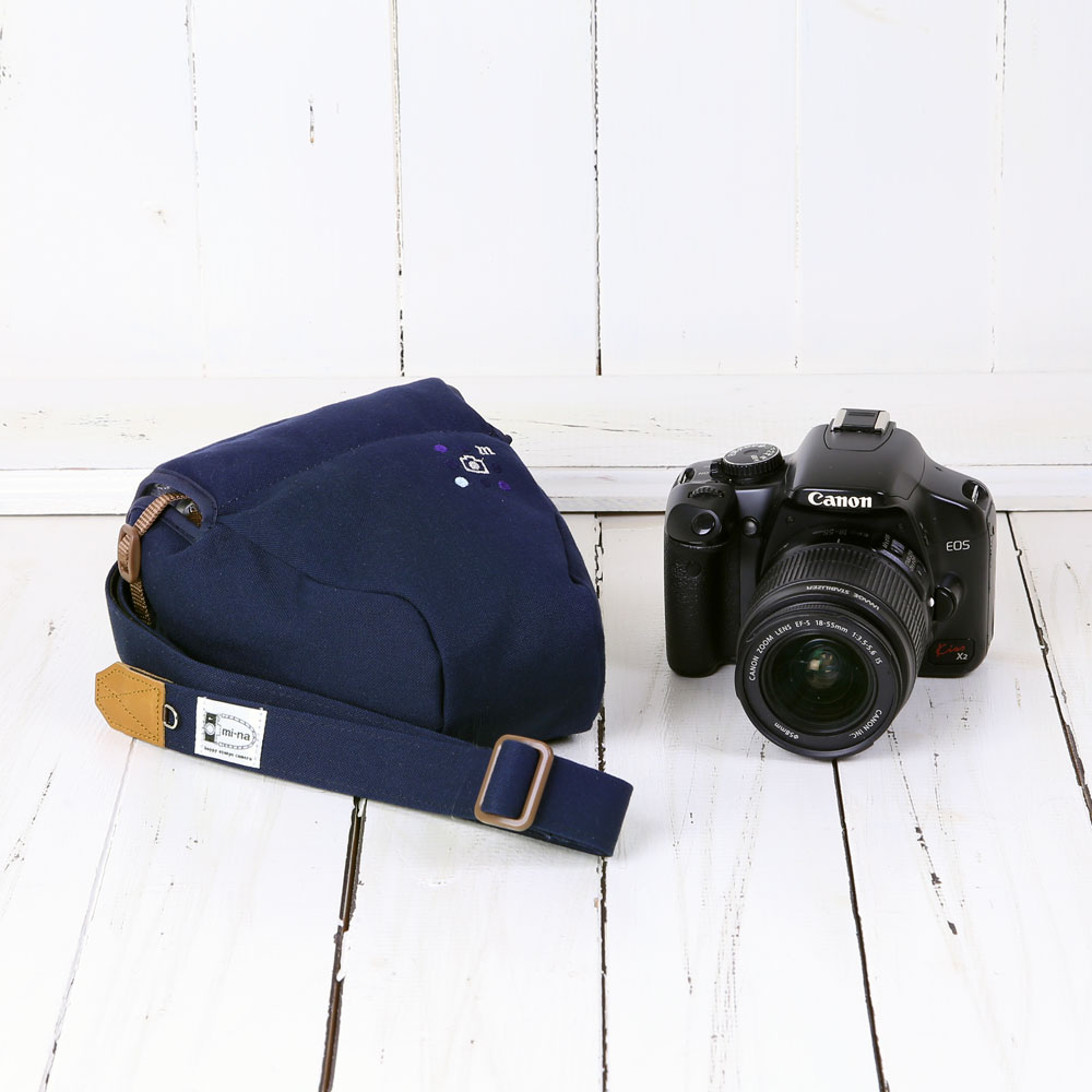 カメラケース camera case カメラカバー MI-NA ミーナ おしゃれ かわいい 女子 一眼レフ ミラーレス 「カメラのお洋服 スリム」ネイビー 帆布 needlework(刺繍)シリーズ