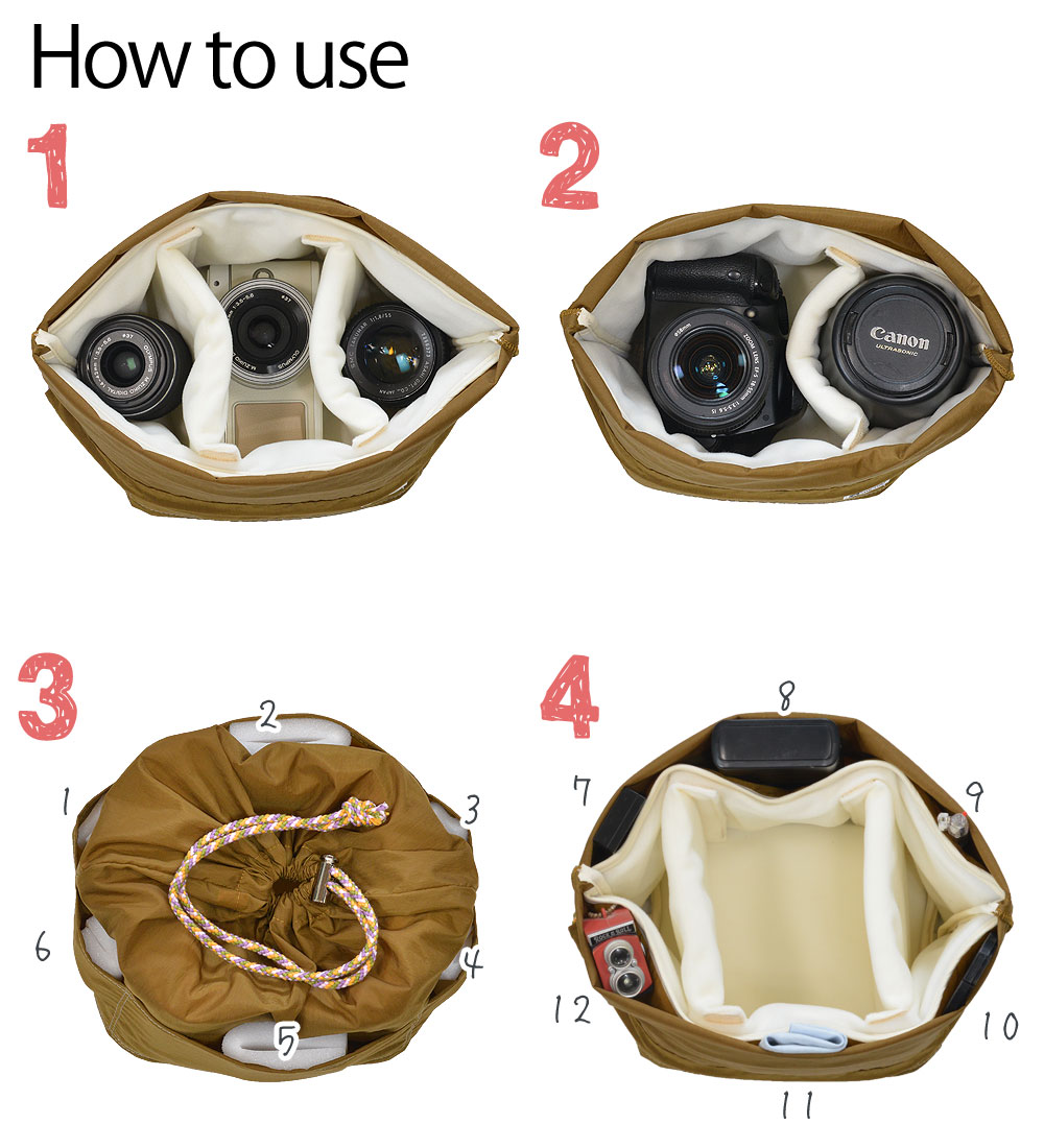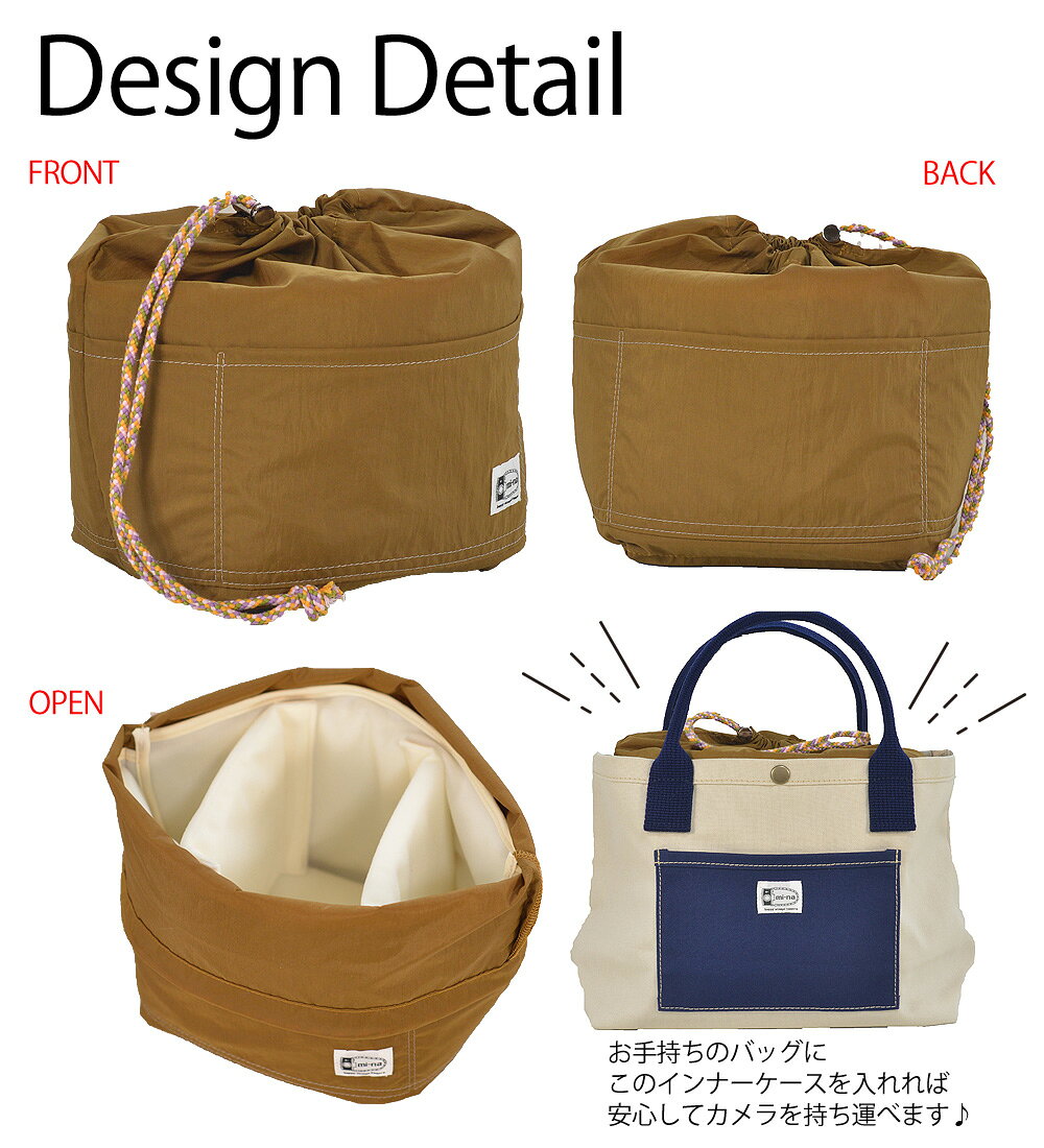 【当店のご紹介】 mi-na (ミーナ)は、カメラ女子 のための カメラストラップ カメラケース カメラバッグ の専門店です。 アウトドア キャンプ グランピング に最適な デジタル一眼レフカメラ、ミラーレス一眼カメラ 用のカメラ用品 もございます。12ポケットインナーバッグ/カーキブラウン カメラをお気に入りのデイリーバッグに入れたいけど直接ポンと入れるのはなんとなく不安だし、バッグの中でいつもカメラを探してしまうのでもっと整理して入れたい…そんなお客様の声に応えてデザインしたのが“巾着インナーケース”です。ポケットもたくさん付いたソフト仕上げのエアリ―感で色々なバッグの形状にフィットしやすい仕様になっています。 紐をキュッと結ぶと、ころんとかわいい巾着のインナーケースになります。外側には6個のポケットがあり小物を入れておくのに便利です。そして巾着タイプですが、カメラをすぐに取り出したい方は、上部を外側に折り返してバッグにセットして頂くとスムーズに取り出し可能です。表地と中の生地がバイカラーになってオトメゴコロをくすぐるデザインに仕上げました。お手持ちのバッグにこのインナーケースを入れれば安心してカメラを持ち運べます♪ 自由に稼働する仕切りが2枚ついています。自分仕様にアレンジしましょう! 1.ミラーレス一眼カメラとレンズ2本 2.一眼レフカメラとレンズ1本 3.外側に便利な6個のポケット 4.なんと内側にもポケットが6個あります。なくすと困る細々したものを収納するのにピッタリ! 表地は肌触りの良いなめらかな生地となっています。カラフルなコードも注目ポイント♪外ポケットにはダブルステッチのブルーカラーが効いていてオシャレな仕上がりに。 【素材】表地:ポリエステル 裏地:ポリエステル ウレタン材 【重さ】110g 【ポケットの数】12個 日本製 made in japan ≪こんなカメラに最適です≫ この商品は、当店のオリジナル商品です。コピー販売及びオークション等での転売は固くお断りいたします。