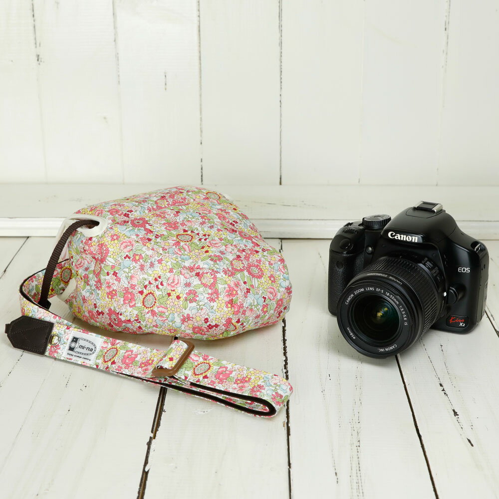 【当店のご紹介】mi-na (ミーナ)は、カメラ女子 のための カメラストラップ カメラケース カメラバッグ の専門店です。デジタル一眼レフカメラ、ミラーレス一眼カメラ 用の おしゃれで かわいい グッズを多数取り揃えています。カメラのお洋服スリム/フラワーガーデンピンク 女性が一眼カメラを持ってお散歩している姿をよく見かけます。「カメラ女子」という言葉が定着するほど人気ぶり♪でもカメラケースって男の子っぽいので女の子仕様にしたいと思っている方が多いのではないでしょうか。そんなカメラ女子さんにカメラのお洋服を提案しちゃいます!!! 表地は華やかなフラワーたちが描かれたコットン地をチョイス。裏地は、表地に合わせた色合いのストライプ柄をセレクト。全体的にちょっぴり大人めな可愛さに仕上げました。何気ない出来事をキリトリにあなたのカメラを準備してこのケースと一緒にhappy osanpo camera♪しませんか☆ ▲商品はカメラケースのみです。カメラストラップは付属しませんのでご了承の上お買い求めくださいませ。撮影で使用したストラップ(フラワーガーデンピンク/取付テープの幅8mmフリータイプ)は⇒コチラ かわいさ+機能性にこだわりました♪ カメラをやさしくサポートしてくれるゴムバンドが付いているのでホールド感があって安心フィット仕様。裏地と同じ柄の布地でシャーリングしているので見た目もキュート!マジックテープは、サイズに合わせて微調整フィットさせることができて便利です。カメラストラップがついている状態で出し入れが簡単なフォルムになっています。カメラストラップスリットが決め手に!! カメラを守る… 厚みのある中綿を採用してふんわりふっくら仕上げでしっかり大切なカメラを衝撃から守ってくれます。分解すると…3層でふかふか~♪裏地も表地も可愛さたっぷり♪カメラを出し入れするたびに乙女心をくすぐられそうな生地をチョイスしました。 落下防止テープ付き ケースの内側にはテープが付いています。カメラストラップにつけるとケース落下防止になり、便利です。 取り外しはスナップボタンでパチンと簡単に!カメラを取り出してもすっきり撮影OKですよ☆クリアポケットにはメモリーカードのような小さな物を入れる場合は落ちてしまう恐れがありますのでご注意ください。 ▽▼▽このケースに入るカメラの最大サイズ▽▼▽ ※上記サイズ以内のカメラでも形状により入らない場合もあります。当店で確認済みの機種のみ表示していますので詳しい対応機種は機種別対応表でご確認ください。 ・機種別対応表は→コチラ ・購入者様のご報告は→コチラ 【素材】コットン 裏地:コットン 【重さ】50g 日本製 made in japan 左右非対称デザイン 一眼カメラは、どの機種もレンズの取り付け位置が左寄りになっています。そのため、このカメラケースは左右非対称デザインを採用しました。立体裁断により微妙な曲線を実現し、幅広い機種に合うサイズにしています。このデザインは、当店のオリジナルデザインです。また、生地の裁断は金属の型で高い精度で裁断し、1点、1点丁寧に技術力の高い日本のプロの職人が縫製して仕上げています。 ≪こんなカメラに最適です≫ この商品は、当店のオリジナル商品です。コピー販売及びオークション等での転売は固くお断りいたします。このページの販売商品はカメラケースのみです。カメラストラップは付属しませんのでご了承の上お買い求めくださいませ。
