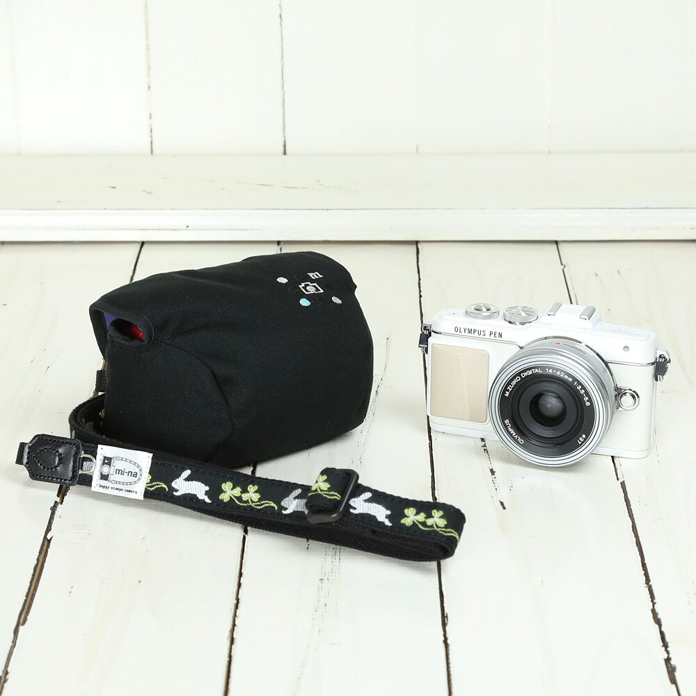 【当店のご紹介】mi-na (ミーナ)は、カメラ女子 のための カメラストラップ カメラケース カメラバッグ の専門店です。デジタル一眼レフカメラ、ミラーレス一眼カメラ 用の おしゃれで かわいい グッズを多数取り揃えています。カメラのお洋服ナノ/帆布ブラック 小型ミラーレス一眼カメラ用ケースカバー“カメラのお洋服ナノ”が遂に登場デス!カメラを直接バッグにポンと入れるのは少し不安・・・という時に簡単コンパクトにカメラを入れられ、ふわふわ軽量、その上キュートな柄のラインナップという3拍子揃ったこのケースが大活躍すること間違いなし。このケースにはメモリーカードやレンズキャップなどを入れておくのにgoodなポケットがあってとっても便利!機能的でキュートなこのケースはカメラ女子さんにぴったりなおススメアイテムです☆ ≪ブラック needlework(刺繍)シリーズ≫ 表地は丈夫な11号帆布で、緩衝材を内蔵させることでソフトな風合いに。裏地はドット柄のコットン地をセレクト。その日のコーディネートのお洒落なアクセントになるように仕上げました。 ▲商品はカメラケースのみです。ベルトは付属しませんのでご了承の上お買い求めくださいませ。撮影で使用したストラップ(帆布/長さ調節タイプ)は⇒コチラ かわいさ+機能性にこだわりました♪ 背面にマジックテープがついており、開け閉めもとってもラクチンです。フタを開けると、ケース背面にオープンタイプのポケットがあり、レンズキャップやSDカードなどを入れられます。フィット感を大切にしたカットワークでキュートなスリムボディに仕上がっておりふっくら柔らかい風合いも魅力です。 カメラを守る… レンズを覆うカブセの部分全体に厚みのある中綿をたっぷり配置しています。ふんわりふっくら仕上げで大切なカメラを衝撃から守ってくれます。分解すると…3層でふかふか~♪ケースの背面部分には、ウレタン素材が入っていて液晶画面を安心サポート! カメラのボディをしっかり保護してくれます。裏地も表地も可愛さたっぷり♪カメラを出し入れするたびに乙女心をくすぐられそうなプリントをチョイスしました。 落下防止テープ付き ケースの内側にはテープが付いています。カメラストラップにつけるとケース落下防止になり、便利です。 取り外しはスナップボタンでパチンと簡単に!カメラを取り出してもすっきり撮影OKですよ☆ ▽▼▽このケースに入るカメラの最大サイズ▽▼▽ このケースは小型ミラーレス一眼カメラにパンケーキレンズ等の薄型レンズを 付けた状態でご使用いただくのが最適です。 ※上記サイズ以内のカメラでも形状により入らない場合もあります。当店で確認済みの機種のみ表示していますので詳しい対応機種は機種別対応表でご確認ください。 ・機種別対応表は→コチラ ・購入者様のご報告は→コチラ 【素材】表地:11号帆布 裏地:コットン 【重さ】60g 日本製 made in japan ≪こんなカメラに最適です≫ この商品は、当店のオリジナル商品です。コピー販売及びオークション等での転売は固くお断りいたします。 このページの販売商品はカメラケースのみです。カメラストラップは 付属しませんのでご了承の上お買い求めくださいませ。