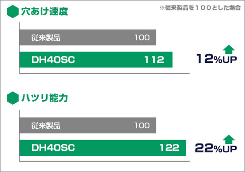 「日立工機」のブランド名が「Hikoki」に変わります。この為、当社の在庫状況により「HiKOKI」商品をお届けする場合がございますので予めご了承のほどお願い申し上げます。 六角軸40mmハンマドリルです。クラス最速の穴あけスピードとハツリ能力を実現。ハンマ機構部の負担を軽減する連続から打ち防止装置と、緩衝機構を搭載し本体の耐久性がアップしました。本体はコンパクトで狭い場所でも扱いやすい形状です。滑りにくく手にフィットするサイドハンドルを採用しました。 特長 ピーディな穴あけと高いハツリ能力 デジタルエンジニアリングによる最適設計で優れた性能を実現。従来機(DH38SS)と比べ穿孔速度が12%、ハツリ量が22%もアップしました。 低振動で好フィーリング ダンパの体積とエアクッションの容積を大きくすることでピストン反力と衝撃を低減。本体の浮き上がりガ少ないため、軽い押し付けでも十分な性能を発揮します。 大型スイッチで操作しやすい スイッチの大形化と手にフィットする握りやすい形状で、操作性が向上しました。 サイドハンドルで作業負担を軽減 滑りにくく手にフィットする2層成形サイドハンドルを採用しました。ソフトな握り心地で作業負担を軽減します。 先端工具の交換も簡単 先端工具の交換も簡単に行えるので、工具の使い分けも容易です。 狭い場所でも使いやすい 機能的かつ堅牢感あふれるシンプルデザイン。サイドハンドルを外せば余計な出っ張りがなく、扱いやすい形状です。 寸法 仕様 品番 DH40SC 能力ドリルビット 40mm コアビット 120mm 電源単相交流 50/60Hz 電圧100V モーター単相直巻整流子モーター 電流 11.6A 消費電力 1100W 回転数620min-1(回/分) 打撃数2800min-1(回/分) 質量 7.2kg 振動3軸合成値回転+打撃 12.3m/s2(EN60745-2-6規格に基づき測定) 打撃 11.8m/s2(EN60745-2-6規格に基づき測定) コード2心・5m 標準付属品 ケース・サイドハンドル・ストッパ・ハンマグリースA HiKOKI 電動ハンマドリル 比較表型番DH40MCDH40SCDH40SE2軸SDSmax六角軸六角軸ドリルビット40mmコアビット120mm電源100V 単相交流 50/60Hzモーター単相直巻整流子モーターACブラシレスモーター電流11.6A13.5A消費電力1100W1,150W回転数620min-1(回/分)250~500min-1(回/分)全負荷打撃数2800min-1(回/分)1,400~2,800min-1(打撃/分)