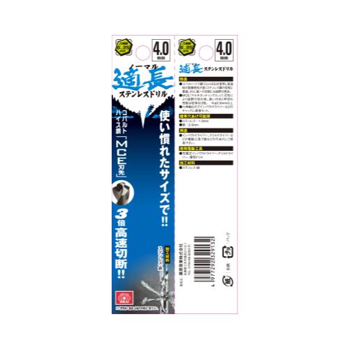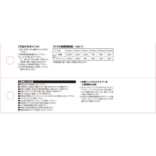 ・用途以外のご使用はしないで下さい。ご使用前に本製品に亀裂や欠け、軸のゆるみがないかご確認下さい。使用する電動工具本体の取扱説明書をよく読み正しくご使用下さい。 ・保護メガネやマスク等の作業に適した服装でご使用下さい。まわりの安全をご確認いただきご使用下さい。揮発性可燃物(ガソリンやシンナーなど)の近くではご使用にならないで下さい。 ・ドリル刃には十分注意して下さい。加工材料は動かないようにしっかり固定して下さい。使用後のドリル刃及び加工材料は高温になります。ドリル推奨回転数を目安に使用下さい。市販の水溶性切削油のご使用をお勧めします。無理な負荷をかけてご使用にならないで下さい。 使い慣れたサイズ、コバルトハイス鋼MCE刃先で従来比3倍の高速切断が可能な適長ステンレスドリルです。 SK11 六角軸Coステンドリル 普通 4.0mm 4977292329132 ステンレス、鉄の穴あけ。 ■特徴 ・コバルトハイス鋼(Co-HSS)を使用し、高温時の耐摩耗性が高く、ステンレス鋼の切削に最適です。 ・鉄への切削にも寿命抜群です。 ・六角軸なのでインパクトドライバーなどのチャックに直接セットできます。 ・MCE(マルチカッティングエッジ)刃先により切れ味抜群、食い付きと早切れ性能は従来比の3倍です。 ■仕様 ・サイズ:4.0mm。 ・標準穴あけ可能厚:(ステンレス)1.0mm・(鉄)2.0mm。 ・軸:六角軸6.35mm。 ・使用電動工具:充電式インパクトドライバー・ドリルドライバー・電気ドリル。 ・加工材料:ステンレス・鉄。 ・寸法 :7×95×7mm ・重量 :0.001kg ・パッケージ寸法 :35×155×10mm ・パッケージ重量 :0.001kg ※改良により予告なく形状や仕様が変更になる場合があります。ご了承ください。