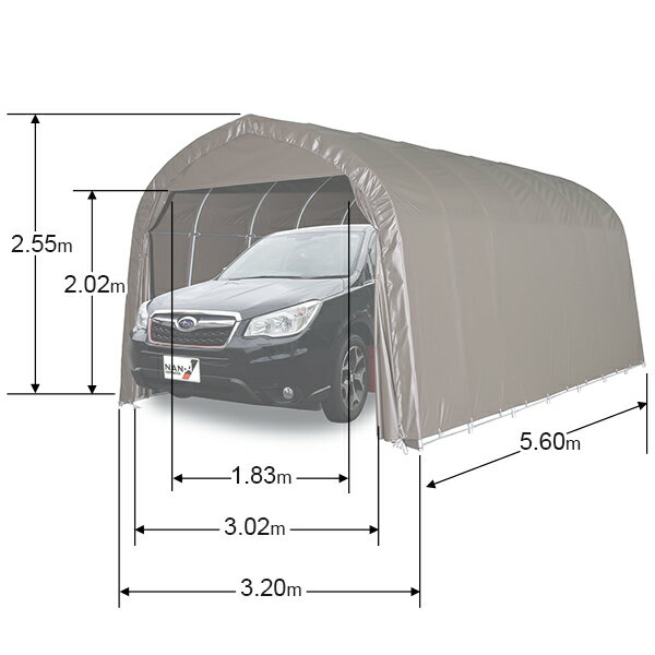 ワンボックスタイプ用のパイプ車庫です。風や雨から大切な車を守ります。建築許可も不要で、自分で組み立てられます。 特長 ・自分で簡単に組み立てられ、短時間で素敵な車庫が完成します。 ・屋根だけの車庫より、雨や風、ホコリから愛車をしっかりガードします。 ・車庫以外に、物置や作業スペースとしても活躍します。 ・分解して移設や収納も簡単に行えます。 寸法図 型番3256U SB 用途 ワンボックスタイプ用 仕様埋込式・サイドオープン・前後幕付き 生地SB (幕色:スーパーブラウン) 本体幅3.20m 下開口幅3.02m 上開口幅1.83m 奥行5.60m 本体高さ2.55m 開口高さ2.02m アーチ本数8本 パイプ径25.4mm 別売りオプション 3256U/B兼用 天幕 SB 3256U/B兼用 前幕 SB 3256U/B兼用 後幕 SB 3256U用 フレーム補強キット
