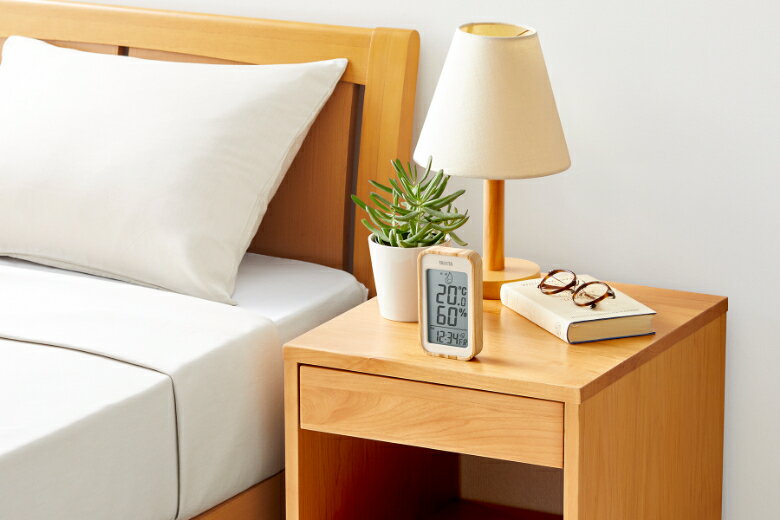商品説明 高級感のある木目調デザインの温湿度計。過去の最高・最低温湿度を表示する機能も付いているので、不在時でもお部屋の温湿度がどこまで変動したかがわかります。 寝室やリビングの乾燥が気になる方や、ペットや観葉植物のお世話をしている方にもおすすめです。 商品特徴 高級感のある木目調デザイン お洒落なインテリアになじむ木目シリーズ。癒やしと安らぎを与えるナチュラルテイストながらも、インテリアのワンポイントとなるようなカラー。 掛け置き自由 本体背面にはマグネット、壁掛け穴がついているので、置き掛け自由。 不在時のお部屋の状態がわかる 過去の最高・最低温湿度を表示する機能※が付いているので、お部屋の温湿度がどこまで高くなった(低くなった)かがわかります。 ペットや観葉植物のお世話をしている方にもおすすめです。 ※リセットしてから現在までの最高・最低温湿度の測定値を表示します。測定値の更新は手動のリセットが必要となります。 お部屋の快適さを表示 計測された温湿度より不快指数を計算し、「寒い」「快適」「暑い」の快適表示をします。 商品仕様 測定範囲 温度:-5.0~50.0℃湿度:20~95% 最小表示 温度:0.1℃湿度:1% 測定精度 温度:0.0~40.0℃ ±1.0℃ それ以外 ±2.0℃湿度:35~75% ±5% それ以外 ±10% 表示周期 20秒毎 日付・時刻表示 12時間・24時間表示切替 アラーム機能 鳴動時間:約30秒 音量:65dB以上 カレンダー表示 月・日・曜日 最高最低温湿度表示 ○ 快適レベル表示 快適表示*温度Td(℃)、湿度H(%)としたとき、不快指数=0.81Td+0.01H(0.99Td-14.3)+46.3 (寒い:不快指数60未満、快適:不快指数65以上70未満、暑い:不快指数75以上) 表示文字高 23mm フック穴 ○ マグネット ○ 電源 1.5V DC(単4形乾電池(R03)×1本) 電池寿命 約1年(1日1回アラームを使用した場合) 主な材質 ABS、PMMA 主な付属品 取扱説明書(保証書付)、お試し用電池(単4形乾電池(R03)×1本) 本体寸法 幅 75mm × 高さ 132mm × 奥行 30mm 本体質量 約 168g(電池含む) 保証期間 1年