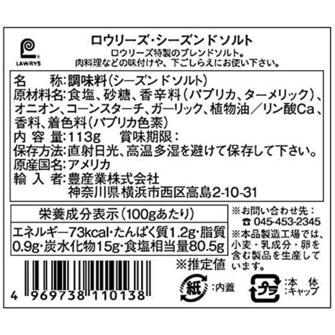 内容量:シーズンドソルト113g×2個 ロサンゼルスの有名なレストラン「ロウリーズ プライム リブ」を代表する商品"シーズンドソルト" 肉、魚、卵、野菜料理をはじめチーズ、サラダ、スープなど様々な料理にご利用頂けます 原材料・成分 食塩、砂糖、香辛料(パプリカ、ターメリック)、オニオン、コーンスターチ、ガーリック/リン酸Ca、香料、着色料(パプリカ色素内容量:シーズンドソルト113g×2個 ロサンゼルスの有名なレストラン「ロウリーズ プライム リブ」を代表する商品"シーズンドソルト" 肉、魚、卵、野菜料理をはじめチーズ、サラダ、スープなど様々な料理にご利用頂けます 原材料・成分 食塩、砂糖、香辛料(パプリカ、ターメリック)、オニオン、コーンスターチ、ガーリック/リン酸Ca、香料、着色料(パプリカ色素