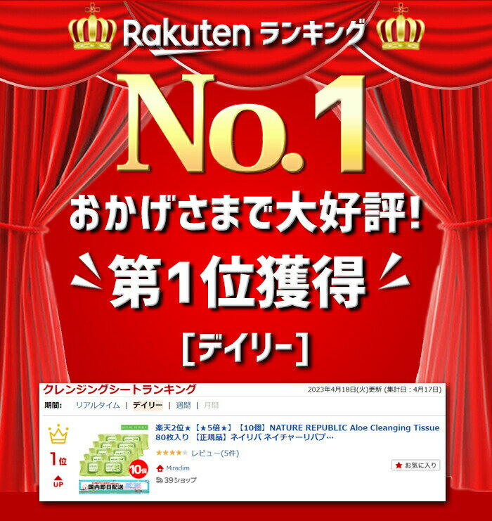 楽天1位★【10個】NATURE REPUBLIC ALOE VERA CLEANSING TISSUE 80枚入り【正規品】ネイリパ ネイチャーリパブリック アロエベラ クレンジング ティッシュ アロエ メイク落とし ふきとり 洗顔 拭き取り 肌荒れ 多目的 使い捨て 旅行 まとめ買い