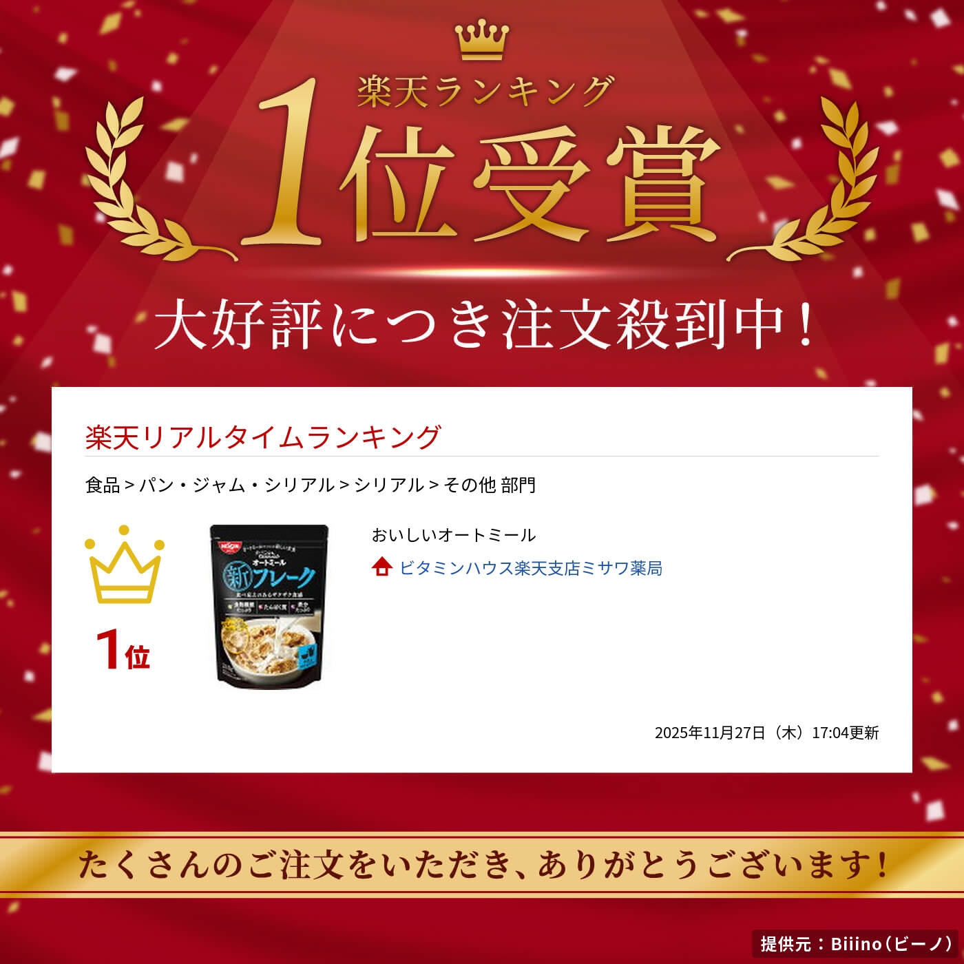 新フレーク 特徴 オートミールでつくった新しい主食 オートミールをフレーク型に加工しました 牛乳をかけるだけ! 147kcal 1食40g当たり 食物繊維たっぷり たんぱく質 鉄分たっぷり 9種のビタミン カルシウム フレークの栄養成分値の比較 おいしいオートミール新フレーク40g 食物繊維:約6.1倍 たんぱく質:約1.3倍 鉄分:約11倍 オートミールでつくった、こだわりフレーク ザクザク食感で食べ応え抜群 素材感じるほのかな甘さ 表示成分 <原材料> オーツ麦加工品(イギリス製造)、小麦全粒粉、砂糖、水溶性食物繊維/乳化剤、炭酸カルシウム、ビタミンC、酸化防止剤(ビタミンE、チャ抽出物)、香料(大豆由来)、ピロリン酸鉄、ナイアシン、パントテン酸カルシウム、ビタミンB6、ビタミンB1、ビタミンB2、葉酸、ビタミンD、ビタミンB12 <栄養成分表示> 1食分(40g)当たり エネルギー・・・147kcal たんぱく質・・・4.0g 脂質・・・1.6g 炭水化物・・・32.8g -糖質・・・26.9g -食物繊維・・・5.9g 食塩相当量・・・0.015g カルシウム・・・50mg 鉄・・・4.0mg ナイアシン・・・6.0mg パントテン酸・・・0.86mg ビタミンB1・・・0.48mg ビタミンB2・・・0.26mg ビタミンB6・・・0.48mg ビタミンB12・・・0.40μg ビタミンC・・・38mg ビタミンD・・・4.0μg 葉酸・・・88μg 用法・用量/使用方法 <食べ方> 牛乳などをかけてお召しあがりください。 そのままでもおいしくお召しあがりいただけます。 冷たい牛乳でも!温かい牛乳でも! じっくりロースト 特徴 食物繊維たっぷり 糖質ひかえめ※ たんぱく質 鉄分 カルシウム ※本品と精白米を比較した場合 ロールドオーツ おいしさの秘密 オートミールをオーブンでじっくりローストしました! ●ロースト感のある香ばしい風味 ●こんがりと色づいたオートミール ●粒感のあるしっかりとした食感 アレンジいろいろ サラダ チャーハン リゾット クッキー 表示成分 <原材料> オーツ麦フレーク(オーストラリア製造)、水溶性食物繊維、小麦粉/炭酸カルシウム、酸化防止剤(ビタミンE)、ピロリン酸鉄 <栄養成分表示> 1食分(30g)当たり エネルギー・・・118kcal たんぱく質・・・4.1g 脂質・・・3.1g -飽和脂肪酸・・・0.60g -n-3系脂肪酸・・・0.03g -n-6系脂肪酸・・・1.12g 炭水化物・・・21.1g -糖質・・・16.7g -食物繊維・・・4.4g 食塩相当量・・・0.005g カルシウム・・・36mg 鉄・・・1.5mg ビタミンB1・・・0.08mg 不飽和脂肪酸・・・2.49g 用法・用量/使用方法 <食べ方> ○そのまま簡単に お好みのフルーツやナッツを加え、牛乳、ヨーグルトなどをかけてお召しあがりください。 ○お鍋で煮込んで 鍋に水など約150mLを入れて沸騰させ、本品30gを加え、中火で約5分加熱してください。 ○レンジで温めて 1.深めの耐熱容器に本品と水を入れます。 本品量30g:水45mL 2.ラップをかけずに電子レンジで温めます。 500W:約3分 600W:約2分30秒 3.ラップをかけて約3分蒸らします。 4.ヤケドに注意してラップを外し、全体をかき混ぜたら完成です。 新ご飯 特徴 オートミールでつくった新しい主食 食べた人の約91%がごはん感を感じた!!※3 ごはんのようなもちもち食感 糖質ひかえめ※1 たんぱく質12.6g※2 卵と一緒に食べた場合 食物繊維たっぷり オートミールを米つぶ型に加工しました ごはんの代わりに レンジでも!お湯でも! ※1 本品50g(お茶碗約1杯分)と卵(50g)に対して、白米ごはん1杯(150g)と卵(50g)を比較した場合 ※2 本品50g(お茶碗約1杯分)と卵(50g)を合わせた場合 白米ごはんの栄養成分値:日本食品標準成分表2020年版(八訂)「水稲めし/精白米/うるち米」 卵の栄養成分値:日本食品標準成分表2020年版(八訂)「鶏卵/全卵/生」 ※3 当社調べ 2023年11月 試食調査(オートミールユーザー100名)「ごはん感を感じる」と回答した人の割合 アレンジいろいろ おにぎり お茶漬け 卵かけごはん カレー 本品と白米ごはんの比較(卵をかけた場合) おいしいオートミール新ごはん50g(お茶碗約1杯)+卵(50g)※2 糖質:約40%オフ たんぱく質:約1.2倍 食物繊維:約2.5倍 ※2 卵の栄養成分値:日本食品標準成分表2020年版(八訂)「鶏卵/全卵/生」 表示成分 <原材料> オーツフラワー(イギリス製造又は国内製造)、おからパウダー(大豆を含む)、小麦粉/乳化剤、炭酸カルシウム、酸化防止剤(ビタミンE、チャ抽出物) <栄養成分表示> ○30g エネルギー・・・119kcal たんぱく質・・・3.9g 脂質・・・2.7g -飽和脂肪酸・・・0.54g -n-3系脂肪酸・・・0.03g -n-6系脂肪酸・・・1.04g 炭水化物・・・21.6g -糖質・・・18.1g -食物繊維・・・3.5g 食塩相当量・・・0.006g 鉄・・・1.1mg ビタミンB1・・・0.12mg 不飽和脂肪酸・・・2.16g ○50g(お茶碗約1杯分) エネルギー・・・199kcal たんぱく質・・・6.5g 脂質・・・4.5g -飽和脂肪酸・・・0.91g -n-3系脂肪酸・・・0.05g -n-6系脂肪酸・・・1.74g 炭水化物・・・36.0g -糖質・・・30.2g -食物繊維・・・5.8g 食塩相当量・・・0.010g 鉄・・・1.8mg ビタミンB1・・・0.20mg 不飽和脂肪酸・・・3.59g ○50g(お茶碗約1杯分)+卵(50g) エネルギー・・・270kcal たんぱく質・・・12.6g 脂質・・・9.6g -飽和脂肪酸・・・2.47g -n-3系脂肪酸・・・0.11g -n-6系