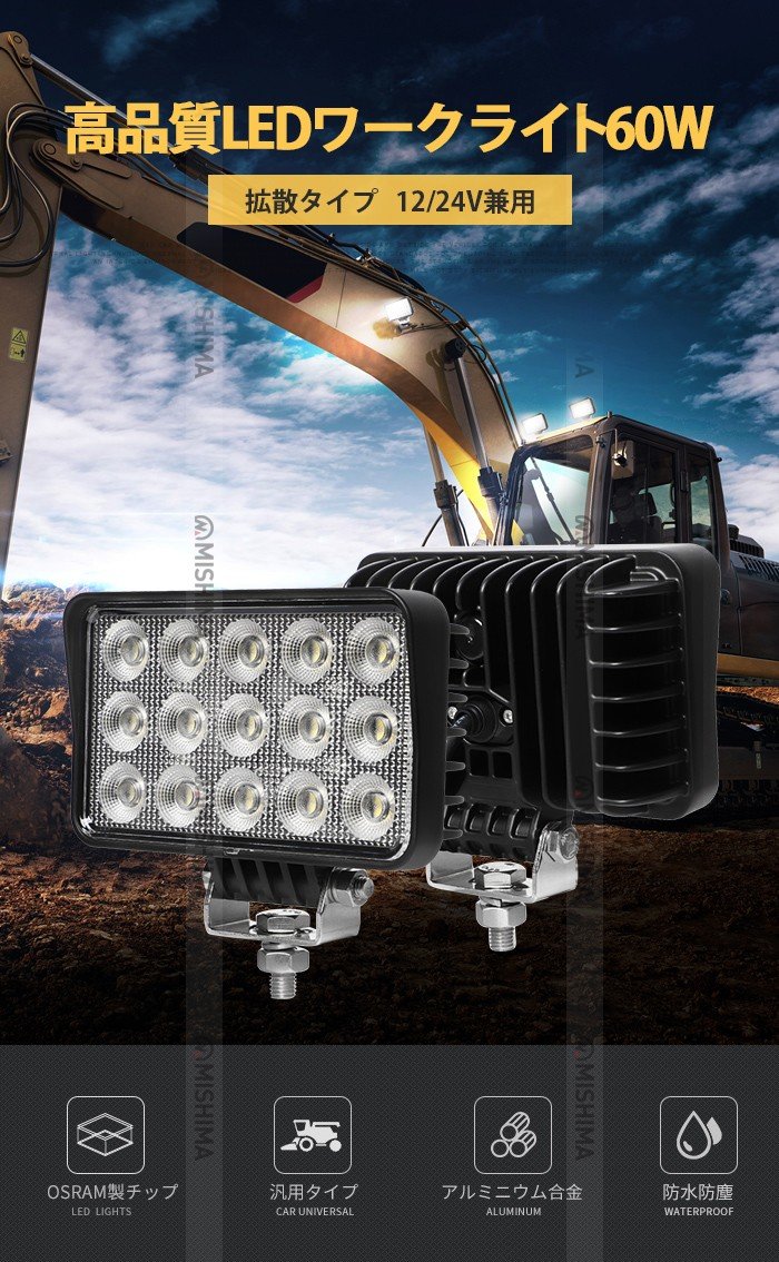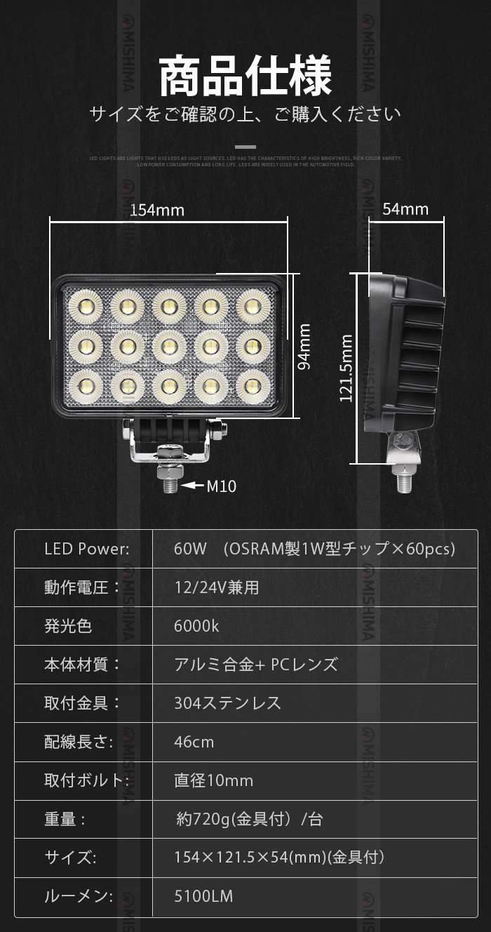 LED超高輝度作業灯 60W 防水・防塵 12V/24V対応 OSRAMチップ搭載 ワークライト LED作業灯 【特徴】 ・OSRAM製1Wチップ60個搭載で強力な明るさを実現。 ・アルミ合金とPCレンズで優れた耐久性と耐衝撃性。 ・304ステンレス製ステーで錆びにくく高い耐久性。 ・IP67防水・防塵性能で、厳しい環境でも使用可能。 ・12V/24Vの広範な電圧対応で様々な車両に対応。 ・多角度調整可能な取り付けステーで簡単設置。 ・レビュー投稿で保証期間が最大14ヵ月に延長。 【用途】 ・工事現場や農業機械の夜間作業照明。 ・車両のタイヤ灯、バックライト、デッキライトとして。 ・除雪機や重機での夜間作業に最適。 ・漁船や船舶の作業灯・集魚灯として使用可能。 【適用車両・機械】 ・農業機械:トラクター、ラッセル車など。 ・建設機械:ブルドーザー、クレーン車など。 ・自動車:JEEP、SUV、ATV、バギーなど。 ・トラック:除雪車、積載車、作業車両など。 ・船舶:デッキライトやサーチライトとして。 【スペック】 LEDパワー 60W(OSRAM製1W型×60pcs) 動作電圧 10V〜30V対応 防水・防塵性能 IP67 照射角 広角タイプ(拡散) 明るさ 5100ルーメン 色温度 6000K(昼白色) 本体材質 アルミ合金+PCレンズ 付属ステー 304ステンレス製 配線長さ 約46cm 取付ボルト M10 使用寿命 約30,000時間 重量 約720g(金具含む) サイズ1 154×94×54(mm) サイズ2 154×121.5×54(mm)(金具含む) 【注意事項】 ・レビュー投稿により保証期間が14か月まで延長されます。 ・初期不良は商品到着後1週間まで対応し、その期間の送料は当社が負担します。 ・保証期間内に当社商品の品質不良が発生した場合、代替品と交換するか、故障部品の修理対応を行います。 ・保証期間中の無償交換は一度のみです。 ・ノイズ対策はされていますが、電源や周波数の状態によってはLEDの作動に影響がある場合もあります。LED自体の作動に問題がなければ保証対象外となります。 関連商品 LEDサーチライト: ・丸型 90W 混合タイプレンズカバー ホワイト発光 ・角型 90W 拡散/集光タイプ 9000ルーメン ・丸型 128W ホワイト/イエロー発光 ・ドーム型 120W 遠距離照射 ・リモコン付き 回転 360°・上下角度 120° LEDライトバー: ・50W / 100W / 150W / 200W 集光タイプ ・ハイパワー 10W型LED 60W-240W 拡散/集光/混合タイプ ・18W-234W 拡散タイプ ・四段チップ 72W / 108W / 144W / 180W 拡散/集光/混合タイプ バイク フォグランプ/ヘッドライト: ・12W 丸型 広角照射 ・9W 広角(90度)/狭角照射(8度) ・20W 集光タイプ 小型サーチライト LED作業灯: ・シガーソケットタイプ 27W ・楕円型 65W LED作業灯 ・温度制御機能付き LED作業灯 24W パイプステー: ・丸パイプ用(超厚肉/小口径タイプ) スイッチ付きリレーハーネス: ・一灯式/二灯式 スイッチ付きLED作業灯: ・36W 丸型 背面ON/OFFスイッチ付き ・13.5W 小型 持ち手/スイッチ付き ・30W 角型 背面ON/OFFスイッチ付き SEOキーワード 作業灯LED, 作業灯LED12V, 作業灯LED24V, 作業灯12V, 作業灯24V, 作業灯LED車, ワークライトLED, ワークライト12V, ワークライトLED車, ワークライト車, ワークライト作業灯, ワークライト24V, ワークライトLED12V 【店舗内関連キーワード】:船舶用 車用 トラック用 夜釣り用 建設機械用 農業機械用 現場作業 夜間作業 投光器 看板灯 集魚灯 防水 防塵 外装用品 外装パーツ 作業用品 作業パーツ ヘッドライト 汎用 ライトバー ledライト 船 led サーチライト 屋外 作業灯 屋外 車 led ライトバー 車 12v led作業灯 漁船 led ライト 野外 led作業灯 車 用 ストロボ フラッシュ ライト led作業灯 トラック フォグランプ 小型 48v led ライト 12v バックランプ 作業灯 led ワークライト led作業灯 ledワークライト サーチライト 24v led 作業灯 12v 24v 広角 24v led 作業灯 バイク フォグランプ オフロード トラクター 作業灯 取り付け サーチライト hid 作業灯 led 100v 三島 パイプステー 農業・建設機械 トラック用品 トラクター・重機 前照灯 防水バック マグネット台座 パイプ 軽トラ hidワークライト 48v 角型 led作業灯 12v ルームランプ mishima 船 サーチライト bri シガーソケット ledワークライト タイヤ灯 船舶用 コンパクト 軽量 融雪機 led集魚灯 融雪 led投光器 漁船 osram カットライン 作業灯 led バックランプ 三島 金具 屋外 除雪機 バイク ledフォグランプ スイッチ 軽トラ作業灯 5のつく日 cree サーチライト led t10 バックライト 24v 作業灯 強力磁石 rgb 充電式 ledライト hid led ライトバー 集魚灯 led ライト led ライト 充電式 100v 12v 24v h4 led led サーチライト led 作業灯 t10 イエロー オフロード オレンジ スイッチ付き ステー スポットライト トラクター トラック ノイズ ノイズレス バー フォグランプ ブラケット マグネット ライト ライトバー リモコン リレーハーネス ワークライト 後付け 広角 作業灯 車 取り付け 充電式 小型 照明 船 船舶 投光器 配線 爆光 汎用 防水 用