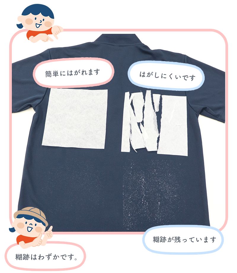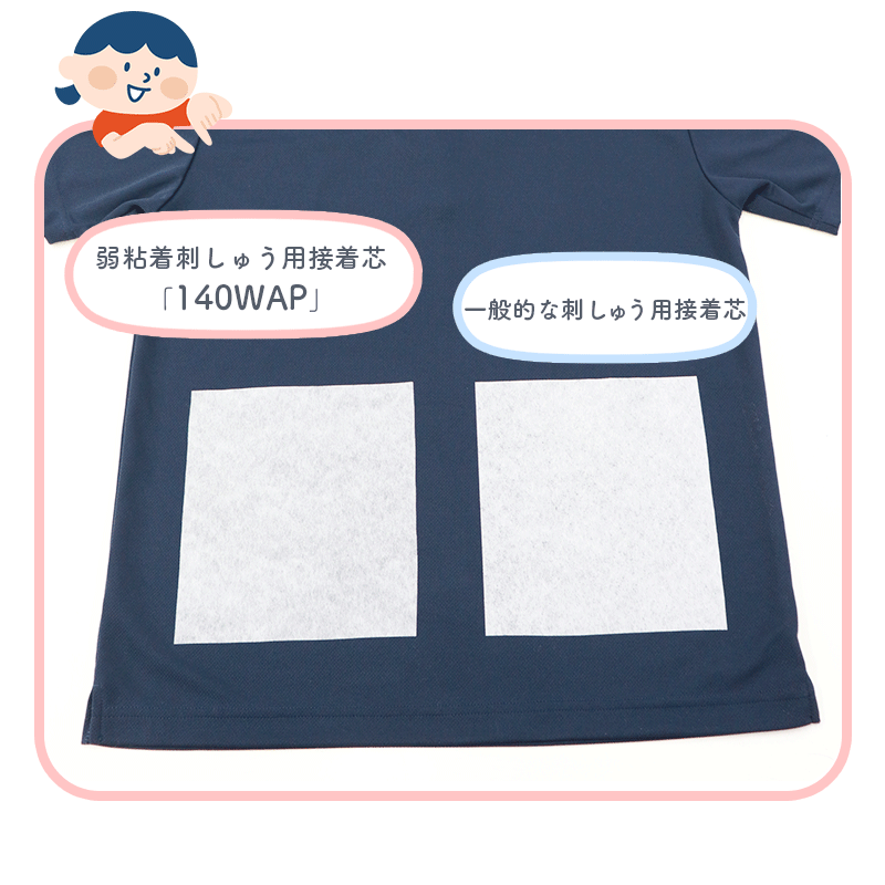粘着力が弱いので刺しゅうした後にはがしやすいのが特徴です。 Tシャツなど衣類への刺しゅうにおすすめです。 刺しゅうをした後にはがしやすく糊跡がつきにくい弱粘着刺しゅう用接着芯「140WAP」! 違いを検証! ~強伸縮素材のポロシャツに同じ条件でアイロン接着しました~ Tシャツ、タオルなど特殊素材への刺しゅうは 弱粘着刺しゅう用接着芯「140WAP」がおすすめです!! ※32cm×1m × 3枚は、1mずつカットしたものが3枚届きます。 ※32cm×10m ×1枚(1ロール)は、10メートル巻きのロールの状態で届きます。