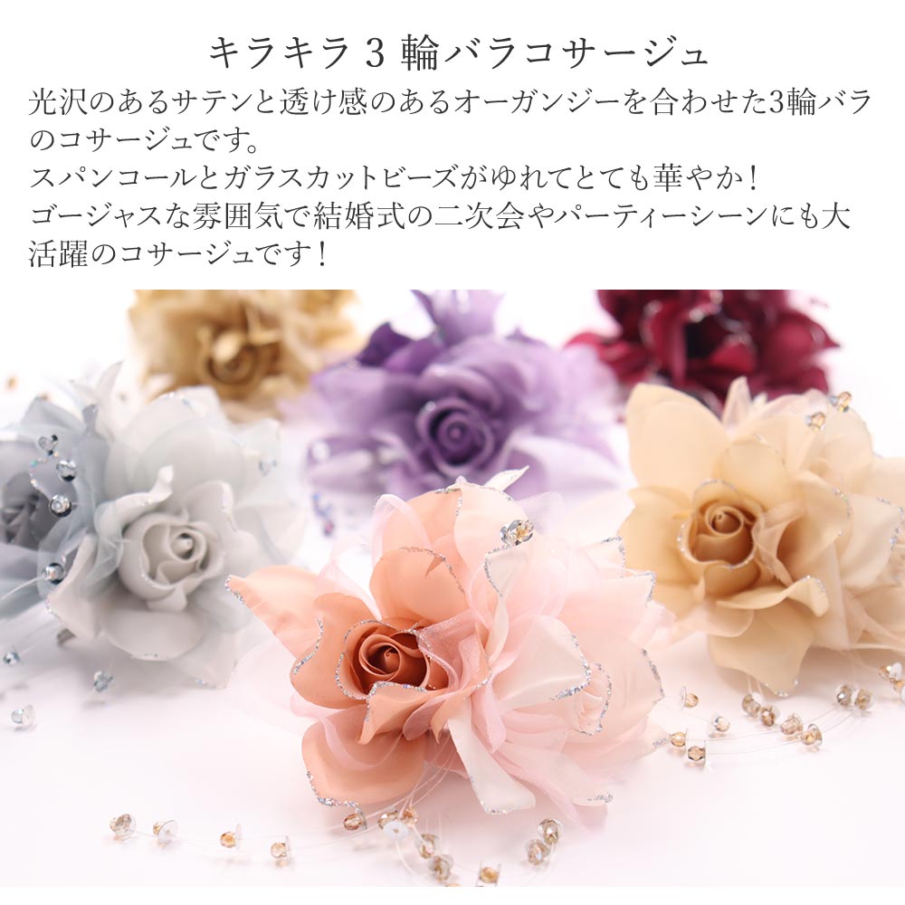 コサージュ ブローチ 日本製 フォーマル 結婚式 ゲスト 卒業式 卒園式 入学式 入園式 キラキラ3輪バラコサージュ 高級 浴衣 ゴールド シルバー ネイビー グレー ピンク ベージュ 母の日