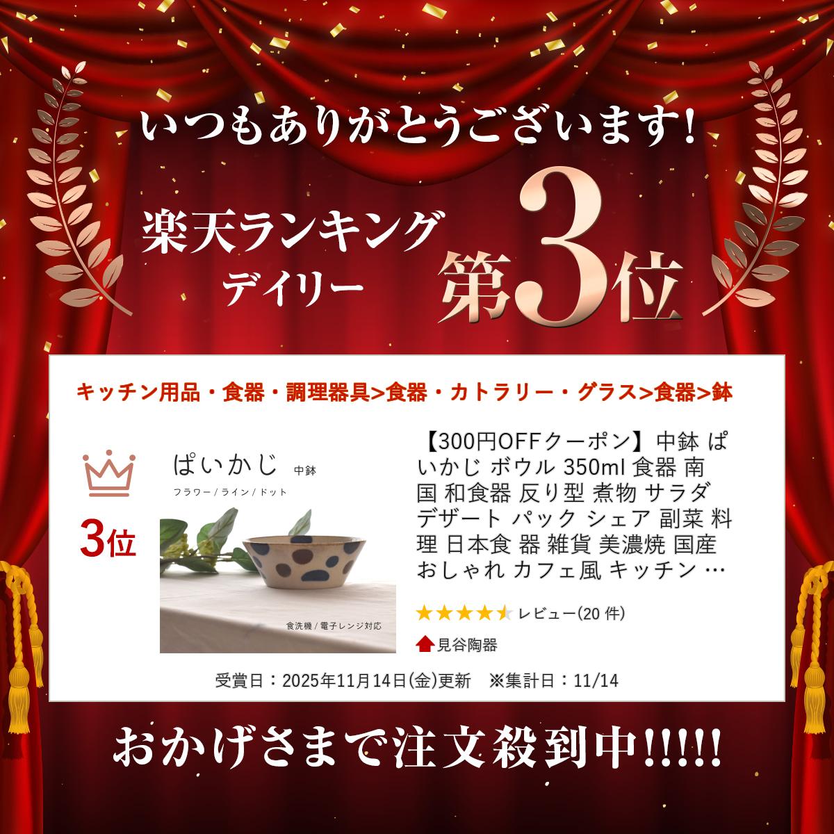 商品情報 サイズ口径13.9×高さ5.1cm 本体重量210g 容量350ml 素材・材質陶磁器 原産国日本 原産地- ※注意事項※ ・お客様のお使いのモニター発色の具合によって実際の商品と色合いが異なる場合があります。 【商品説明】 飽きのこない素朴なカラーリングで仕上げた、「ぱいかじ」。温かみのあるぱいかじの柄は、決して料理の邪魔をせず引き立ててくれます。いつもの食器に少し物足りなさを感じてきたら、こんな南国風のムードが高まる器を選んでみるのはいかがでしょうか? 【色・柄の特徴】 暖かい雰囲気になれるアイボリーの釉薬を使用しております。器の柄はフラワー・ライン・ドットの3柄からお選びいただけます。お箸は、その3柄にストライプと風車を追加した5柄からお選びいただけます。 【形状の特徴】 容量があり、持ちやすいボウル形です。 【注意事項】 商品の特性上、色むら、釉ダレなどの差が生じる場合がございます。また、少しザラザラした感触と感じる場合もあります。職人が一つひとつ手で仕上げをしておりますので、それぞれの商品が持つ個性としてお楽しみいただければ幸いです。 【季節の贈り物やイベントごとに】 正月・年賀・年始・ひなまつり・こどもの日・母の日・父の日・お盆・御中元・残暑見舞い・敬老の日・ハロウィン・寒中見舞い・クリスマス・御歳暮 ・年末年始・バレンタイン・パーティー・ホームパーティー 【お祝いの品として】 贈答品・ギフト・贈り物・プレゼント・誕生日・バースデー・結婚・結婚祝い・出産・出産祝い・節句・七五三・祝還暦・61歳・還暦・還暦御祝い・還暦祝・華甲・新築祝い・引っ越し祝い・引っ越し御祝い・入園祝い・入学祝い・進学祝い・祝卒業・卒業祝い・就職祝い・転職祝い・退職祝い・保育園・幼稚園・小学生・進学内祝い・入学内祝い・結婚内祝い・快気祝い・全快祝い・快気内祝い・退院祝い・内祝い・合格祝い・成人式・記念日・周年記念・引き出物・紅白還暦祝い(60歳)・古希祝い(70歳)・喜寿祝い(77歳)・傘寿祝い(80歳)・米寿祝い(88歳)・卒寿祝い(90歳)・白寿祝い(99歳)・百寿祝い(100歳) 【大切な人やお世話になった方への贈り物に】 家族・お父さん・お母さん・おじいちゃん・おばあちゃん 親戚・兄弟・姉妹・子供・先生・恩師・職場・上司・先輩・後輩・同僚・取引先 【法人向けにも】 転職・お餞別・贈答品・粗品・おもたせ・手土産・心ばかり・寸志・記念品・景品・御開店祝・開店御祝い・開店お祝い・開店祝い・御開業祝・開業御祝い・開業お祝い・開業祝い・御開院祝・開院御祝い・開院お祝い・開院祝い 【お礼やご挨拶の品に。ちょっとした手土産にも】 プチギフト・お土産・手土産・山形土産・挨拶・ご挨拶・御挨拶・ごあいさつ・お見舞い・御見舞・引っ越し・引越し挨拶・粗品・お使い物・ご進物・贈答用・贈答品・お礼・御礼・お宮参り御祝・志・進物 【イベントの景品としても!】 クリスマス・新年会・忘年会・歓迎会・送迎会・同窓会・宴会・二次会・ゴルフコンペ・ボーリング大会・ビンゴ大会・結婚式・結婚式二次会・婚活パーティー・サッカー・フットサル・野球・ゲーム・スポーツ・景品・参加賞・粗品 【いろんなお客様にご利用いただいております】 女性・男性・主婦・料理人・プロ・飲食店・シェフ・子供・キッズ・ソムリエ・お弁当女子・料理男子・ボディビル・ボディービル・キャンプ女子 【こんな商品をお探しの方に!】 かわいい・食器・白い食器・青い食器・オシャレ・新生活向け・陶器・美濃焼・現代風・バラエティ豊富・子供用・大人・味のある食器・渋い・綺麗・きれい・美しい・映える・SNS映え・インスタ映え・コーヒー・アイスコーヒー・ビール・ビアグラス・ビールグラス・焼酎・芋焼酎・刺身・刺盛り・刺身盛り合わせ・漬物・犬・犬用・猫・猫用・イヌ用・ネコ用・イヌ・ネコ・動物のエサ・エサ・インテリア・インテリア雑貨・小物入れ・使いやすい・日用品・水飲み