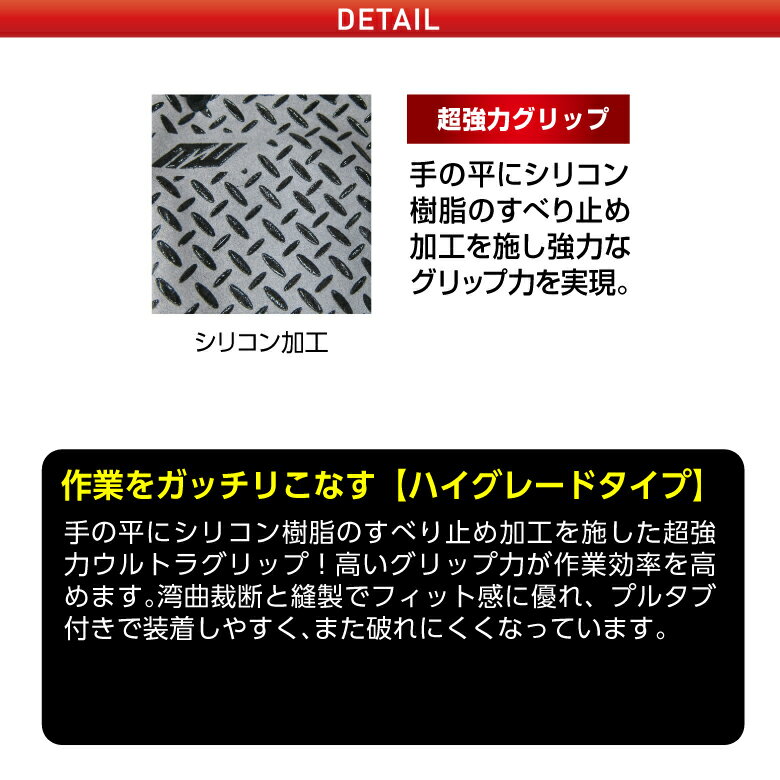 【スエード調の生地】 手の平部分はスエード調の厚手の生地を使用し、よりハードな作業に耐えられる商品です。 【グリップ力】 シリコン樹脂のすべり止め加工を施し、強力なグリップ力を実現しました。 【フィット感】 湾曲裁断と縫製でフィット感に優れています。 【装着のしやすさ】 プルタブ付きで装着しやすく、破れにくくなっています。 【何度も洗える】 特殊加工により、汚れたら何度も洗ってご使用いただけます。 【汗拭きパッド】 ちょっと拭きたい汗をタオル地パッド部分ですばやく拭えます。 ●平部:ナイロン・ポリウレタン・シリコン樹脂 ●甲部:綿・ポリエステル・EVA・その他