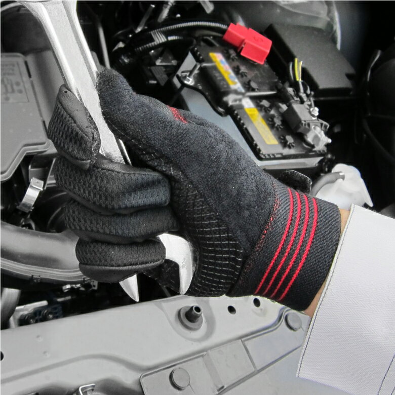 通気性を追求した、ハイパフォーマンスタイプ! グローブの悩みの一つとしてムレがあげられます。 汗ばむ手をいかに快適にするか、通気性を良くするにはどうしたらいいかを追求したグローブです。 甲と手の平部にメッシュ生地を使用し、強度を上げるため手の平部はシリコン樹脂で加工し、指のマチにPUを使用しました。 それにより高いグリップ力と強度が備わり、通気性がありながらしっかりと手を保護します。 ベンチレーションや汗拭きパットなど、多機能で使いやすさを備えたハイパフォーマンスのグローブです。 【通気性】 手の甲・手の平が両面メッシュなので抜群の通気性です。 ムレを抑え快適に作業ができます。 【ベンチレーション機能】 指マチ部分にベンチレーション機能を施し指のサイドの通気性も確保しています。 【エアーメッシュ生地】 通気性に優れ、手の平・手の甲と両面メッシュ素材なので不快なムレを軽減し快適な着け心地です。 【指マチPU】 通気性に特化した生地を使用するため指マチ部分に、PUを使用し強度と立体感を持たせました。 指をしっかり保護します。 【指先3D縫製】 指先のフィット感を高める立体縫製は、細かな作業にもしっかり対応! 【補強アテ付き】 親指と人差し指の付け根に補強アテを付け、耐久性を高めています。 【汗拭きパッド】 親指部分はタオル地になっているため、ちょっと汗を拭きたいときにすばやく対応でき便利です。 【手の平シリコン樹脂加工】 手の平はシリコン樹脂加工で、すべり止め効果抜群。 高いグリップ力で作業効率もUP! 【洗濯OK】 洗濯できますので、いつも清潔に保つことができ、何度でも繰り返し使用できます。 【ストレッチ】 グローブ全体にストレッチ性があります。 両サイドに配置した赤いストレッチ生地が手の動きにフィットし、手を“開く”“握る”の動きを妨げません。 肉厚な手の方にもオススメです。 【リストバンド】 デザイン性のあるリストバンドは伸縮性があり柔らかくフィットします。 【マジックラバー】 マジックタイプで手首をしっかり固定でき作業効率もUP! 好みのフィット感に調整ができます。 ●ポリエステル・ポリウレタン・シリコン樹脂・その他