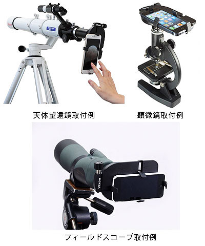 ・スマートフォン(カメラ付)を天体望遠鏡など光学機器に取付けてスマートフォンで手軽に天体写真が撮影可能。 ・ 天体望遠鏡に取付けて月面や惑星の撮影、顕微鏡に取付けてミクロ撮影、フィールドスコープに取付けて野鳥の撮影などが可能。 対応スマートフォンサイズ:幅58〜110mm、高さ108〜200mm、厚さ15mm以下、レンズ中心から左10〜40mm、右23〜70mm以内レンズ中心から上6〜45mm、下81〜158mm以内 接続可能接眼部:φ19〜53mm、高さ20mm以上の円筒形の天体望遠鏡、顕微鏡、フィールドスコープアイピース等 耐荷重:約300g以下(推奨) 本体サイズ:149×90×56mm(含・突起部) 本体重量 :178g(含・補助スリーブ) 付属品:補助スリーブ×3個 スペーサー×2個 取扱説明書