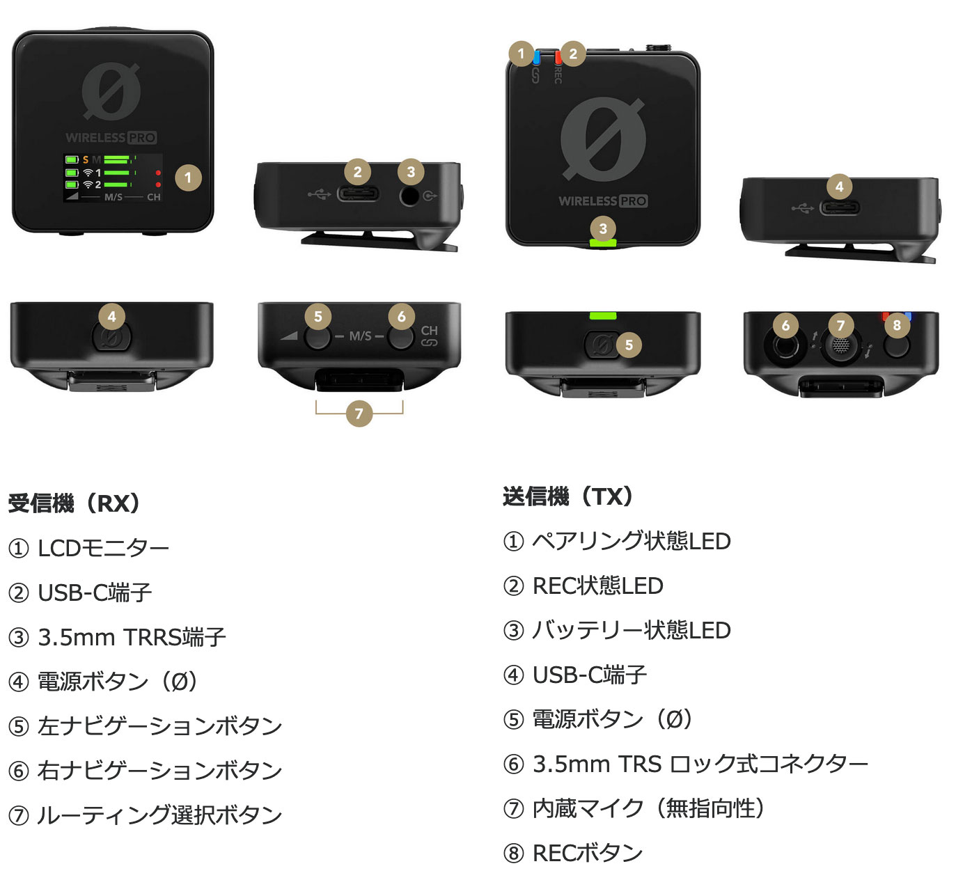 ・ワイヤレスプロは、高音質なマイク内蔵の送信機2台と、撮影機器に接続する受信機1台のデュアルチャンネルワイヤレスマイクシステム。 ・わずらわしい音声ケーブルの配線に縛られることなく、話し手の音声をクリアに収音し、手軽に高音質な録音を実現可能。 ・録音モードは、2台の送信機からの出力を1つにまとめて録音するマージモードと、各送信機の出力を左右別々のチャンネルに録音するスプリットモードを選択可能。 ・送受信機間の伝送には、RØDE最先端のシリーズIV 2.4GHzデジタル伝送と128bit暗号化によるニアゼロレイテンシーコーデックを採用し、最大260m(見通し)までのクリアで安定した音声伝送が可能。 ・同シリーズのデジタル伝送を採用している「ワイヤレスゴーII」「ワイヤレスミー」とも互換性があるため、それぞれの送受信機の組み合わせを入れ替えてペアリングすることも可能。 ・送受信機ともに最大7時間の駆動が可能で、送信機のバッテリー残量、伝送状態は、受信機のLCDモニターで確認が可能。 ・各送信機は32GBの内部メモリを搭載し、受信機に音声伝送をしながら送信機単体でも音声を記録する「オンボード録音」が可能。さらに、オンボード録音ではビットレート 32bit floatでの録音に対応(受信機のデジタル出力は32bit floatに対応していません)。収録時のゲイン調整が不要になり、収録後の編集でゲインを調整できるので、簡単に音割れを回避することが可能。 ・オンボード録音は、起動中は常に録音するモード(オールウェイズ)と、送信機のRECボタンを押すことで録音を開始できるモード(マニュアル)のいずれかに切り替え可能。 ・受信機と接続されていない状態でも、内部メモリに32bit floatで40時間以上の録音データを保存できるため、音声伝送の不具合時のバックアップ用として使用可能。 送受信周波数:2.4GHz 伝送距離:約260m(見通し) ※ご使用の環境により前後する可能性があります タイムコード 規格:SMPTE タイムコード 形式:LTC タイムコード フレームレート:23.98fps、24fps、25fps、29.97fps(ドロップフレーム)、29.97fps、30fps バッテリー駆動時間:最大7時間 電源:内蔵リチウムイオンバッテリー(USB-C端子(5V/0.4A)より充電可能) システム要件:MacOS 10.15以降、Windows 10以降、iOS 14以降、Android 11以降 対応RØDEアプリ:RØDE Central、RØDE Connect、UNIFY、RØDE Central Mobile、RØDE Reporter、RØDE Capture キット内容:送信機(TX)×2、受信機(RX)×1、チャージケースプロ×1、SC2(3.5mm TRS - TRSケーブル)×1、SC21(USB-C - Lightningケーブル)×1、SC22(USB-C - USB-Cケーブル)×1、USB-C - USB-C スーパースピードケーブル×1、マグクリップゴー×2、ウインドシールド(ワイヤレスプロ用)×3、ラベリアII×2、ポップフィルター(ラベリアII用)×2、マイククリップ(ラベリアII用)×2、ミニファーウインドシールド(ラベリアII用)×2、カラーIDリングセット(ラベリアII用)×1、アクセサリーケース×1、クリーニングクロス×1 ■送信機(TX) 形式(内蔵マイク):コンデンサー(プリポラライズド) ポーラパターン(内蔵マイク):全指向性 周波数特性(内蔵マイク):20Hz-20kHz 最大入力音圧(内蔵マイク):123.5dB SPL 等価雑音レベル(内蔵マイク):22dBA S/N比(内蔵マイク):72dB アナログ入力端子:3.5mm TRS ロック式コネクター 内部メモリ容量:32GB ビット深度(オンボード録音):32bit float サンプルレート(オンボード録音):48kHz PC接続端子:USB-C サイズ:H2 × W4.4 × D4.6cm 重量:35g ■受信機(RX) アナログ出力:3.5mm TRRS(3.5mm TRS出力にも対応) アナログ入力:3.5mm TRRS デジタル出力:USB-C サイズ:H2 ×W4.4 × D4.6cm 重量:36g ■チャージケース プロ バッテリー容量:4200mAh(送受信機フル充電2回分) 電源:5V/3A(USB-C接続) 充電時間:約2.5時間 充電電流:2A(最大) サイズ(本体):H8.2 × W10.1 × D7cm 重量:177g(ケースのみ)