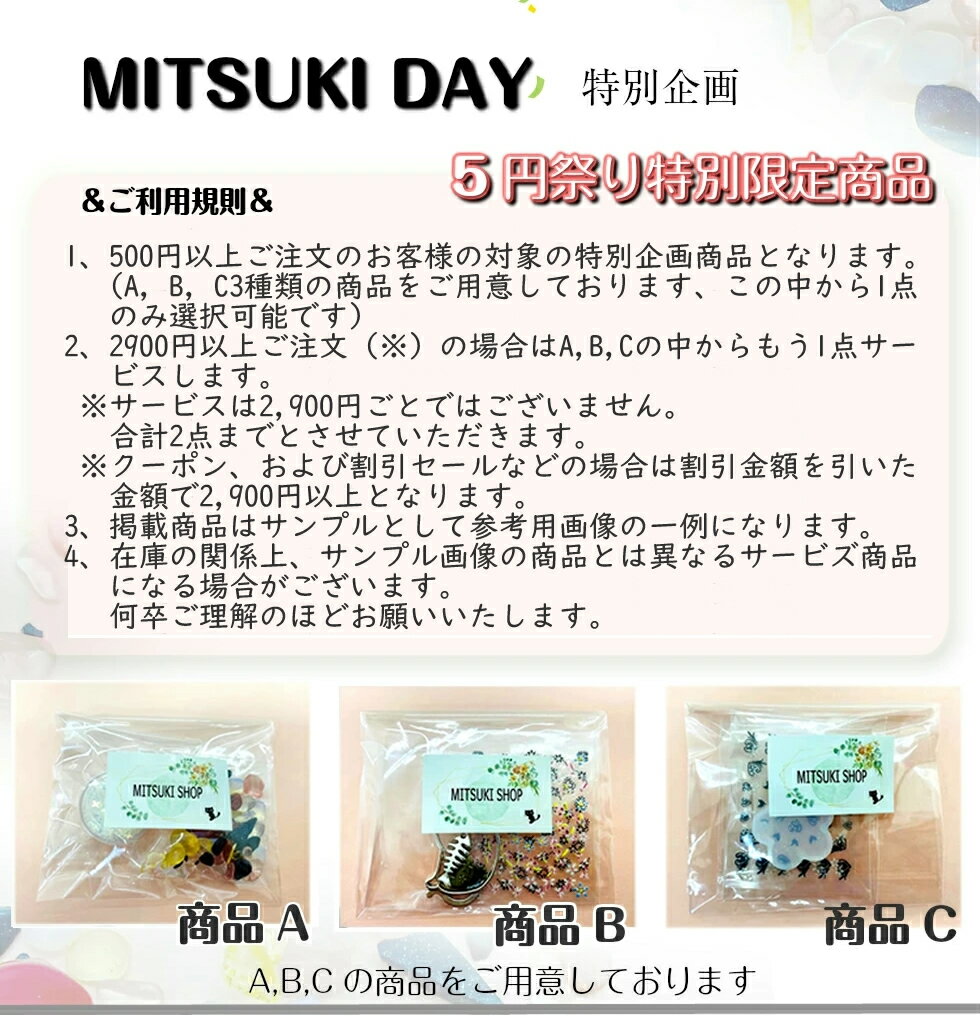 MITSUKI DAY特別企画: 毎月の16日、26日 月に2回開催いたします! *変動の場合がございますご了承ください &ご利用規則& 1、500円以上ご注文のお客様の対象の特別企画商品となります。 ( A,B,C3種類の商品をご用意しております、この中から1点のみ選択可能です) 2、2900円以上ご注文(※)の場合はA,B,Cの中からもう1点サービスします。 ※サービスは2,900円ごとではございません。 合計2点までとさせていただきます。 ※クーポン、および割引セールなどの場合は割引金額を引いた金額で2,900円以上となります。 3、掲載商品はサンプルとして参考用画像の一例になります。 4、在庫の関係上、サンプル画像の商品とは異なるサービズ商品になる場合がございます。 何卒ご理解のほどお願いいたします。 5、ご購入条件を満たさない間違えて購入した場合はお知らせなしで商品のすべてをキャンセルを させていただく事があります。ご理解の程よろしくお願い致します。 5円祭り特別限定商品 商品A 1)水晶と天然石をたっぷり15g以上袋に詰めました 2)人気ホログラム1ケース ※商品の組み合わせはスタッフにお任せします。 商品B 1)空枠やミール皿どちらかを1点、プラスチャーム3点 2)封入素材シートを2枚 ※商品の組み合わせはスタッフにお任せします。 商品C 1)シリコンモールド1点 2)封入素材シートを2枚 ※商品の組み合わせはスタッフにお任せします。 ●モニタやブラウザの関係でカラーが実物と異なって見えることがございます。 【MITSUKI DAY】特別企画 5円祭り特別限定商品 お得セット オマケ おまけ 天然石 シリコンモールド型 しずく型 円形型 四角型 楕円型 通し穴付き シール ホログラム ハンドメイド 材料レジン枠 ミール皿 封入素材 デコファクトリー 福袋