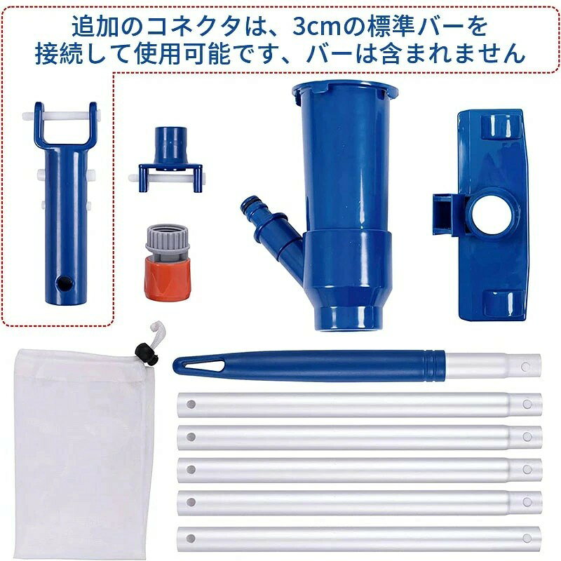 上質な材料で作られ、耐久性があり、ポータブルで持ち運びが簡単、シンプルなデザインはあなたの生活に多くの利便性をもたらす。 この水中掃除機の組み立ては簡単で、標準的なガーデンホース(別購入)に接続し、ホースの水圧で動きます。 ホースの水圧により吸引力が生まれ、落ち葉やゴミが集塵バッグに吸い込まれます。プール、スパ、池、噴水などの清掃に最適です。