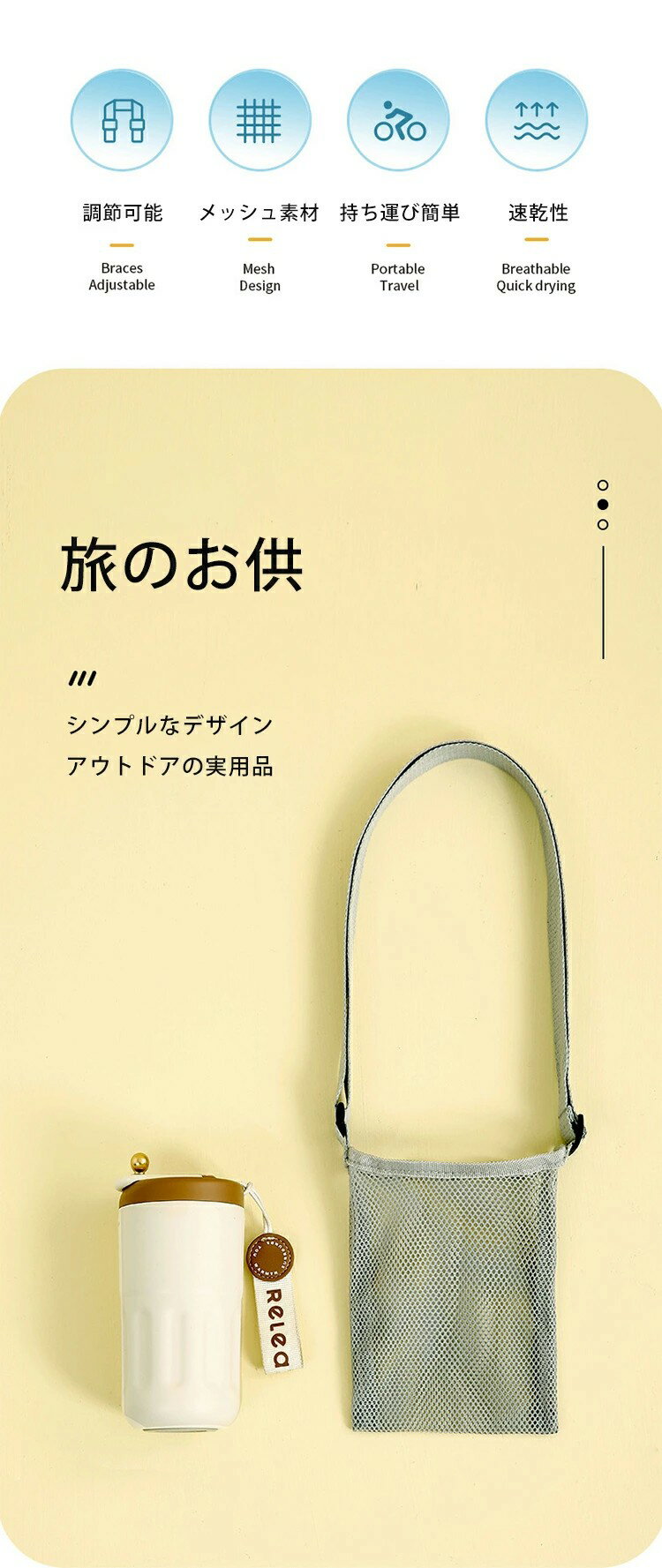 ITEM INFO 仕様 ・サイズ (約)▼ - 幅12*高さ18cm - ストラップ:30-60cm ・重量 (約)▼ - 40g 素材 ・ナイロン カラー ・グレー 特徴 ◆ シンプルな水筒ホルダー!アウトドアの実用品♪ ◆直径10cmまでのほとんどのボ トルに対応、推奨容量600ml以下。様々なボトルに対応♪ ◆ 洗濯機で洗える!お手入れ簡単♪。 ◆ストラップの長さは30〜60cmまで調節可能で、 子どもから大人まで使用できる。 ◆軽量ポリエステル素材、メッシュデザイン、通気性、 速乾性に優れています。♪ ご注意 ● 本商品は、簡易包装にてお送りさせて頂いています。 ● サイズに±2cmの若干誤差が生じる場合があります、予めご了承ください。