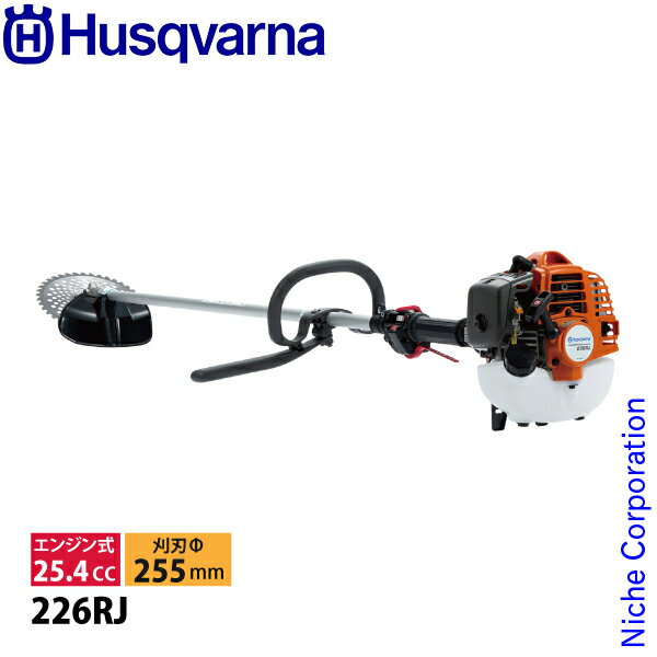 ハスクバーナ 刈払機 226RJ ループハンドル[967055902]▼パワフルな使用感で、平地から傾斜地までハードな雑草刈りにオールマイティに活躍します。ループハンドル。日本モデルには、10”チップソー (Φ255mm×40P)とそれに適応したガード付きです。また、スロットルレバーは、安全に配慮したSTレバーです。■特長●ループハンドル柔軟性を大幅に高めるループハンドルを装備。●ダブルハーネス肩への負担を軽減するダブルハーネスを標準装備。●パージポンプ始動を容易にするパージポンプ●ベベルギア設計実績ある、信頼性の高いギア設計。●堅牢なハンドルシステムハンドルは、耐久性を高めるために、ダイカストクランプによってチューブに取り付けられています。●堅牢なクラッチクラッチは堅牢で、ナイロンコードや直径の大きいブレードを使用した負荷の高い作業にも対応します。●独立式のリコイルスターターコードの取替えなどメンテナンスが簡単な独立式のリコイルスターター。●効率的なエアフィルターサービスコストにつながるエンジンの磨耗を抑える、効率的なエアフィルター。●草刈りに最適なベベルギア草刈りに最高のパフォーマンスを発揮するベベルギア搭載。 ■仕様【エンジン】 排気量:25.4 cm3 出力:0.8kW 燃料タンク容量:0.75L 燃料消費量:720 g/kWh 最大出力時回転数:7,500 r/min Maximum rpm output shaft:7,500 r/min スパークプラグ:NGK BPMR7A【装置】 刈刃:Multi 255-3 ハーネス:シングルハーネス 刈刃:255-80【容量】刈幅25.5 cm【トランスミッション】 Drive gear angle:30 °【本体乾燥質量】4.4kg ※刈刃、刈刃カバー、飛散防護カバー、肩掛けバンド、燃料除く。【騒音】 耳元騒音レベル:93 dB(A) 音響パワーレベル(LWA)保証値:112 dB(A)【振動】 ハンドルの振動レベル (ahv, eq) 、左 / 右:1.5 m/s2 ハンドルの振動レベル (ahv, eq) 、左 / 右:1.5 m/s2【ハンドル形状】ループハンドル※ナイロンコードは付属しておりませんhk3【kk9n0d18p】[ ハスクバーナ Husqvarna パワーツール 草刈り機 草刈機 刈払い機 刈払機 ]2024/08/27