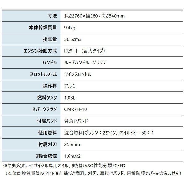 KIORITZ(共立) 刈払機 背負式 ループハンドル+グリップ[RME3200LT]▼新機構AVS採用疲労感を軽減する新フレーム採用■特徴●iスタートリコイル内部に設けたアシスト用スプリングにより、軽い力でゆっくり引くだけで簡単に始動出来ます。●背引きスタート引き力の軽い「iスタート」と「背引き対応リコイルグリップ」の組み合わせにより、背負ったままでも容易にエンジン始動が可能です。 ■仕様【寸法】長さ2760×幅280×高さ540mm【本体乾燥質量】9.4kg【排気量】30.5cm3【エンジン始動方式】iスタート(蓄力タイプ)【ハンドル】ループハンドル+グリップ 【スロットル方式】ツインスロットル【操作桿】アルミ【燃料タンク】1.03L【スパークプラグ】CMR7H-10【付属バンド】背負いバンド【付属刈刃】255mm【3軸合成値】1.6m/s2【使用燃料】混合燃料[ガソリン:2サイクルオイル※]=50:1※やまびこ純正2サイクル専用オイル、またはJASO性能分類FC・FD (本体乾燥質量はISO11806に基づき燃料、刈刃、肩掛けバンド、飛散防護カバーを含みません)hk4【kk9n0d18p】[ 共立 KIORITZ 正規販売店 パワーツール 草刈り機 草刈機 刈払い機 刈払機 刈り払い機 エンジン式 エンジン草刈り機 エンジン草刈機 エンジン刈払い機 エンジン刈払機 エンジン刈り払い機 エンジン式草刈り機 エンジン式草刈機 エンジン式刈払い機 エンジン式刈払機 エンジン式刈り払い機 ]2024/06/10