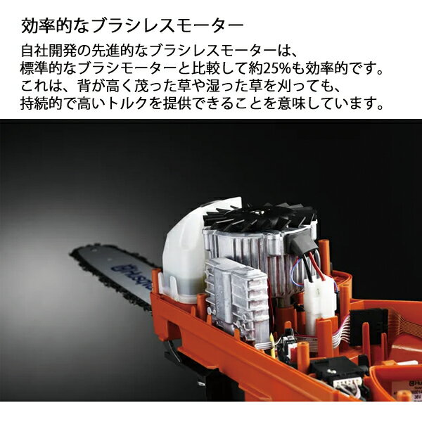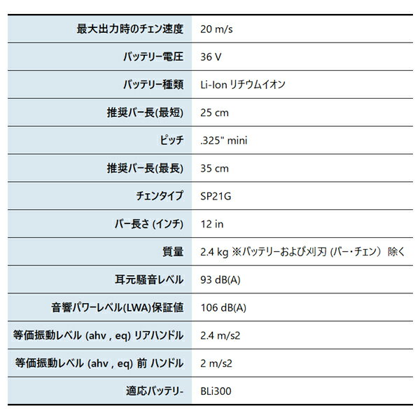 ハスクバーナ バッテリーチェンソー T535iXP SP21G 30cm 本体のみ[970716412]▼高性能で、軽量かつ非常に扱いやすい、プロユーザーのためのトップハンドルチェンソーです。造園業者に最適な一台です。 36 V, Li-Ion リチウムイオン, 30 cm (12”), 2.4 kg■特長●効率的なブラシレスモーター自社開発の先進的なブラシレスモーターは、標準的なブラシモーターと比較して約25%も効率的です。これは、背が高く茂った草や湿った草を刈っても、持続的で高いトルクを提供できることを意味しています。●共通バッテリー36Vリチウムイオン電池パックは、要求が高く、長時間作業するプロ向けに設計されています。刈払機、チェンソーなどのハスクバーナのバッテリー製品で共通のバッテリーを採用しているため、製品間で切り替えて使用ができます。●リフトアップ式のタンクキャップリフトアップ式のタンクキャップは、簡単に開閉できます●ベルト アイレット素早く簡単にクライミング用のロープにつなげることができます。●慣性式チェンブレーキキックバックが発生した場合は、効果的なイナーシャ式チェンブレーキがチェンを直ちに停止させ、負傷の可能性を低減します。●エンジン並みの性能36Vリチウムイオンバッテリーは、エンジン式の製品と同等レベルのパワー、操作性の良さ、長寿命を誇ります。バッテリー駆動なので排出ガスはなく、1回の充電で多くの作業を行うことができます。●ノンストップ作業のためにバッテリーの付属品により、仕事をさらに迅速で効率的に行うことができます。●ロープの留め具ロープを取りつけるため丈夫な留め具があり、これにより簡単にチェンソーを木に引き上げられます。●高回転チェンスピード高回転チェンスピードで、高速でスムーズな切削ができます。●低排出ガス製品この製品を選択することで、従来のガソリン製品と比較して、製品稼働中の二酸化炭素排出量を削減することができます。バッテリー駆動のこの製品は、使用中に CO2 を排出せず、ハスクバーナ製品に期待されるパワーと品質を提供します。 ただし、製造、充電、使用済み廃棄など、製品のライフサイクルの他の段階では、CO2 排出が発生いたします。●直感的キーパッドキーパッドは直感的に操作し、ボタンを押すだけで設定を簡単に調整できます。●savE(TM) モードSavE(TM) モードは、回転数を下げることで稼動時間を最大化し、騒音レベルを低下させて、製品のバッテリー寿命を維持します。フルパワーを必要としない作業に最適です。ボタンを押すだけで、SavE(TM) モードのオン/オフを切り替えることができます。●バー・ナット落下の防止落下防止機能により、ナットの紛失を防ぎます。●自動OFF機能電源が入ったまま置いておくと、3分後に自動的に電源がOFFになります。電池節約と同時に、放置時の怪我のリスクを減らせます。 ■仕様【最大出力時のチェン速度】20m/s【バッテリー電圧】36V【バッテリー種類】Li-Ion リチウムイオン【装置】 推奨バー長(最短):25cm ピッチ:.325” mini 推奨バー長(最長):35cm チェーンタイプ:80TXL コマ数(バーの長さ):51E(30cm) 適合ソーチェーン品番:80TXL051E【質量】2.4 kg (バッテリーおよび刈刃 (バー・チェン)除く)【騒音】 耳元騒音レベル:93 dB(A) 音響パワーレベル(LWA)保証値:106 dB(A)【振動】 等価振動レベル (ahv , eq) リアハンドル:2.4 m/s2 等価振動レベル (ahv , eq) 前 ハンドル:2 m/s2【適応バッテリー】BLi300【kk9n0d18p】[ ハスクバーナ Husqvarna 正規販売店 パワーツール 林業 チェンソー チェーンソー 充電式 バッテリー式 充電式チェンソー バッテリー式チェンソー 充電式チェーンソー バッテリー式チェーンソー バッテリーチェンソー バッテリーチェーンソー 伐木 伐採 農林 森林 樹上 造園 園芸 ガーデニング 剪定 ]2024/06/10
