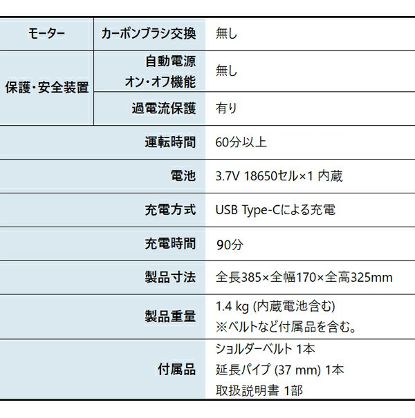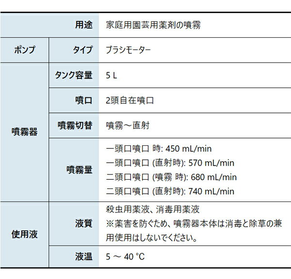 工進 バッテリー内蔵式噴霧器 5L BGT-5HD[508654]▼生垣・庭木の消毒・殺虫に内蔵式バッテリーで、USBで手軽に充電電池交換の手間もかからない噴霧器●乾電池の交換不要で低ランニングコスト●乾電池が不要、軽量化を実現●内蔵バッテリー採用でコンパクト化実現●乾電池式噴霧器と比べて約60%に軽量充電式噴霧器(BGT-5HD)と同等クラスの乾電池式噴霧器(メーカー製品:GT-5HDの場合)は単一電池を6本使用し、乾電池だけでも約1kgの重量になります。電池を使用しないので、その分だけ重量を軽くご使用いただけます。●バッテリー内蔵だから乾電池交換の手間が無い付属のUSB充電ケーブルをつなげば手軽に充電可能。家庭用コンセント(※1)、モバイルバッテリーいずれも充電できます。モバイルバッテリーを一緒にもっていけば、電気の無い場所でもバッテリー切れの心配がなく、安心です。(※2)※1 充電アダプターは別途必要です。※2 充電しながらのご使用はできません。 ■仕様【用途】家庭用園芸用薬剤の噴霧【タイプ 】ダイヤフラムポンプ【噴霧器】【タンク容量】5L【噴口】2頭自在噴口【噴霧切替】噴霧〜直射【噴霧量】 一頭口噴口 時:450 mL/min 一頭口噴口 (直射時):570 mL/min 二頭口噴口 (噴霧 時):680 mL/min 二頭口噴口 (直射時):740 mL/min【使用液】 液質※:殺虫用薬液、消毒用薬液 液温:5 〜 40 ℃※薬害を防ぐため、噴霧器本体は消毒と除草の兼用使用はしないでください。【モーター】カーボンブラシ交換:無し【保護・安全装置】 自動電源オン・オフ機能:無し 過電流保護:有り【運転時間】60分以上【電池】3.7V 18650セル×1 内蔵【充電方式】USB Type-Cによる充電【充電時間】約90分【製品寸法】全長385×全幅170×全高325mm【製品重量】1.4 kg (内蔵電池含む)※ベルトなど付属品を含む。【付属品】ショルダーベルト 1本、延長パイプ (37 mm) 1本、取扱説明書 1部【kk9n0d18p】[ 工進 KOSHIN コーシン パワーツール 噴霧 噴霧器 噴霧機 散布 散布器 散布機 消毒 薬剤 消毒液 殺虫 薬液 薬品 液肥 除草剤 除草材 防除 除草 田 田んぼ 畑 田畑 庭 農作業 農業 家庭菜園 ガーデニング ガーデン 畑仕事 庭いじり 園芸 小型 軽量 コンパクト USB Type-C TypeC USB-C USBC ]2025/04/09