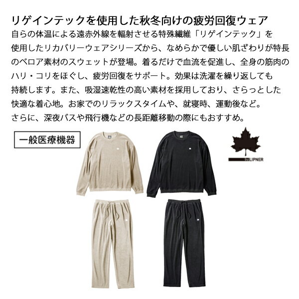 ロゴス リプナー ボディリカバリーベロア スウェット & パンツ セット▼▼▼セット内容▼▼▼各色LOGOS by LIPNERボディリカバリーベロアスウェット(35212)×1LOGOS by LIPNERボディリカバリーベロアスウェットパンツ(35213)×1■特長ロゴスオリジナルのリゲインテックを使用した血行促進ウエア●リゲインテックを使用した秋冬向けの疲労回復ウェア自らの体温による遠赤外線を輻射させる特殊繊維「リゲインテック」を使用したリカバリーウェアシリーズから、なめらかで優しい肌ざわりが特長のベロア素材のスウェットが登場。着るだけで血流を促進し、全身の筋肉のハリ・コリをほぐし、疲労回復をサポート。効果は洗濯を繰り返しても持続します。また、吸湿速乾性の高い素材を採用しており、さらっとした快適な着心地。お家でのリラックスタイムや、就寝時、運動後など。さらに、深夜バスや飛行機などの長距離移動の際にもおすすめ。幅広いサイズ展開でユニセックスで着用いただけます。●着るだけで疲労を回復するリカバリーウェアとはリカバリーウェアは、一般医療機器区分「家庭用遠赤外線血行促進用衣」に分類された疲労回復ウェアです。着るだけで「血行促進」「筋肉の疲労軽減」「筋肉のハリ・コリ緩和」に効果が期待できます。●リカバリーウェアの秘密は、特殊繊維「リゲインテック」にあります。この特殊繊維が身体の内部から放出される遠赤外線(体温)を輻射することにより、血流を促進し、全身のコリをやわらげ、疲労回復をサポートします。寝ている間に、1日の疲れをリカバリーしてくれます。また、素材である繊維そのものに効果があるため、洗濯を繰り返しても機能が持続します。●肌当たりのよいベロア素材なめらかで優しい肌ざわりが特長のベロア素材を採用。ソフトな質感で、素肌に触れても心地よくリラックスタイムをより快適に演出します。ほどよいストレッチ性があり、寝返りやリラックス時の動きにも自然にフィット。●いつでもどこでもリラックスキャンプでのリラックスシーンや、就寝時にもおすすめです。●上下セットアップでご使用ください合わせて着用いただくことで効果が期待できます。■性能/特長●リゲインテックを使用した秋冬向けのワンマイルウエア●肌あたりの良い素材を採用●ルームにも、就寝時にも着用できるリラックスシルエット ■仕様【カラー】ベージュ、ブラック■LOGOS by LIPNERボディリカバリーベロアスウェット■【展開サイズ】S、M、L、XL S:身丈66、肩幅50.5、身幅55、袖丈55、裾口幅55 cm M:身丈68、肩幅52.5、身幅57、袖丈57、裾口幅57 cm L:身丈70、肩幅54.5、身幅59、袖丈59、裾口幅59 cm XL:身丈72、肩幅56.5、身幅61、袖丈61、裾口幅61 cm※衣類は全て平台に平置きして測定しております。※商品によっては若干の誤差が生じる場合があります。1〜2cmの誤差は予めご了承ください。【素材】 本体:ポリエステル 95%、ポリウレタン 5% リブ部分:ポリエステル 95%、ポリウレタン 5%■LOGOS by LIPNERボディリカバリーベロアスウェットパンツ■【展開サイズ】S、M、L、XL S:ウエスト70、股下67、ワタリ幅33、ヒップ100、裾幅17.5 cm M:ウエスト74、股下69.5、ワタリ幅34、ヒップ104、裾幅18 cm L:ウエスト78、股下72、ワタリ幅35、ヒップ108、裾幅18.5 cm XL:ウエスト82、股下74.5、ワタリ幅36、ヒップ112、裾幅19 cm※衣類は全て平台に平置きして測定しております。※商品によっては若干の誤差が生じる場合があります。1〜2cmの誤差は予めご了承ください。【素材】 本体:ポリエステル 95%、ポリウレタン 5% リブ部分:ポリエステル 95%、ポリウレタン 5%[ ロゴス LOGOS LOGOS ろごす 正規販売店 アウトドア ウェア トップス シャツ アパレル メンズ レディース ウィメンズ 男性 女性 男女兼用 ]2025/11/20