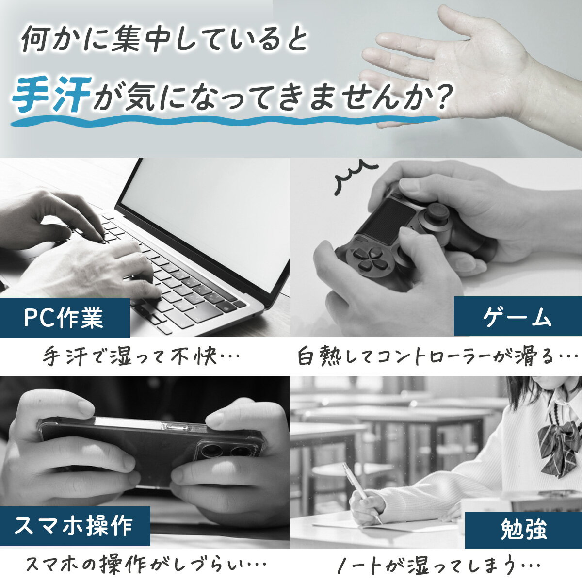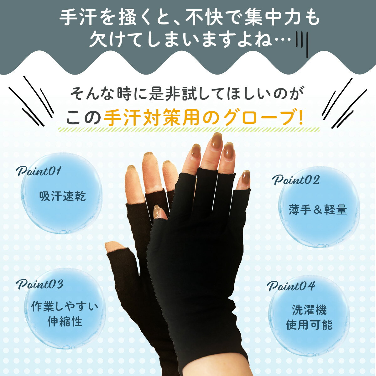 商品情報カラーブラック(黒)、グレー(灰色)、ホワイト(白)サイズ(縦)約17cm (幅)約10cm フリーサイズ(左右兼用)重量 約18g素材吸汗速乾の薄手綿混素材(綿30%/ポリエステル70%)おすすめキーワード手汗 対策 手袋 指なし 手袋 吸汗速乾 綿混 コットン レディース メンズ 男女兼用 ゲーミンググローブ ゲーミング手袋 手汗用手袋 勉強 スマホ ゲーム 作業用 マウス操作 グッズ 子供 学生 夏用 快適 薄手 フィット 滑らない 洗える 汗ばみ対策 手汗止め さらり 綿素材おすすめのシーンプレゼント 父の日 父の日向け 母の日 母の日向け まだ間に合う 敬老の日 誕生日 バースデープレゼント バースデー ギフト 贈り物 就職祝い 祝卒業 進学祝い 卒業祝い 就職祝い 転職祝い 退職祝い 合格祝い 進学内祝い 快気内祝い 入学内祝い 内祝い お祝い バレンタイン ホワイトデー クリスマス クリスマスイブ クリスマスプレゼント 誕生日 成人の日 ノベルティ 転職 粗品 心ばかり 記念品 景品 御開業祝 開業御祝い 開業お祝い 開業祝い 開店祝い 御開院祝 開院御祝い 開院お祝い 開院祝い 学園祭 勤労感謝の日 定年退職 御中元 周年記念 記念品 贈答品 退職祝い 還暦祝い 古希祝い 喜寿祝い 米寿祝い 退院祝い 昇進祝い 栄転祝い 叙勲祝い お年賀 正月 成人の日 節分 旧正月 バレンタインデー ひな祭り ホワイトデー 春分の日 卒業 卒園 お花見 春休み イースター 入学 就職 入社 新生活 新年度 春の行楽 ゴールデンウィーク こどもの日 母の日 父の日 七夕 お中元 暑中見舞 夏休み 残暑見舞い お盆 帰省 敬老の日 シルバーウィーク 孫の日 運動会 学園祭 ブライダル ウェディング ハロウィン 七五三 勤労感謝の日 建国記念の日 お歳暮 大晦日 冬休み 寒中見舞い ブラックフライデー プレゼント 1000円 3000円 2000円 実用的 女性対象の方社会人 大人 大学生 OL 男性 女性 10代 20代 30代 40代 50代 60代 70代 80代 90代 家族 お父さん 父 お母さん 母 おじいちゃん 祖父 おばあちゃん 姉 妹 弟 兄 家族 お姉ちゃん お兄ちゃん 祖母 親戚 兄弟 姉妹 子供 先生 恩師 職場 上司 先輩 後輩 同僚 取引先 チーム 団体 仲間 友達 恋人 夫婦 カップル手汗 対策 手袋 指なし手袋 綿 コットン レディース メンズ ゲーミンググローブ ゲーミング手袋 手汗用手袋 指無し手袋 作業用 手荒れ 男女兼用 夏用 ゲーム 子供 グッズ 手汗対策 ゲーム スマホ ゲーム マウス ゲーム中 手汗対策 グローブ 手汗対策専用 手汗止め ーーーーーーーーーーーーーーーーーーーーーーーーー\吸汗速乾 手汗対策 さらり手袋/勉強・スマホ・ゲーム中の「手汗」にもう悩まない!吸汗速乾素材を使用した、薄手で軽やかな指なし手袋です。手汗をしっかり吸収し、ムレにくくさらっと快適。勉強中にノートが湿る、ゲームのコントローラーが滑る、スマホやマウス操作がしづらい…そんな悩みを解決します。■ 吸汗速乾のさらり素材汗をすばやく吸収し、乾きやすい薄手の綿混素材を採用。やさしい肌触りで通気性がよく、長時間着けても快適。季節を問わず、一年中手汗対策に活躍します。■ 指なしタイプで作業がしやすい指先が自由に動かせるハーフフィンガー仕様。筆記・キーボード・ゲーム操作・スマホタップもスムーズに行えます。縫製のない切りっぱなしデザインで、ごろつかず自然なフィット感。■ 薄手&軽量 約18g軽くてかさばらないので、勉強・オフィス・外出先にも◎ポーチやペンケースに入れて、いつでも手汗対策。男女兼用・右左兼用で家族でもシェアしやすい設計です。■ 洗って繰り返し使えるエコ仕様洗濯機使用OK(手洗いコース推奨)。清潔に保てるから、毎日の手汗対策にもぴったり。汗ばむ季節はもちろん、暖房の効いた室内作業にもおすすめです。■ カラーバリエーション(全3色)ブラック(黒)/グレー(灰色)/ホワイト(白)どんなシーンにも合わせやすい落ち着いたカラー展開。■ セット内容・3組セット(各色1組ずつ)・5組セット(同色5組)用途や家族構成に合わせて選べます。毎日の洗い替えや、勉強・ゲーム・仕事用などの使い分けにも便利です。■ こんな方におすすめ勉強中にノートが湿って困るお子さまにゲーム中やスマホ操作時の滑りを防ぎたい方にパソコン作業・マウス操作時の滑りやムレを防ぎたい方に手荒れ・多汗が気になる方の軽い対策として夏の手汗・冬の室内ムレ対策にも※お使いのスマートフォン、パソコンの機種により多少の色味の変化がございます※入荷時期により商品の色合いや質感、仕様が異なる場合がございます。予めご了承ください。---------------------------------------------------------【商品の発送につきまして】日本郵便 楽天倉庫(関西倉庫)からの出荷となります◆当日出荷エリア宛のご注文大阪府・京都府・兵庫県・奈良県・滋賀県・和歌山県・三重県は、14:00までのご注文で当日出荷、14:00以降のご注文は翌日出荷となります。◆当日出荷エリア宛以外のご注文上記7県以外のエリアにつきましては、14:00までのご注文で通常1~3日後に出荷いたします。また14:00以