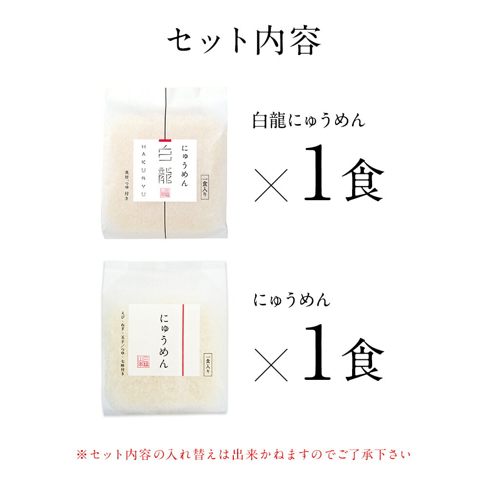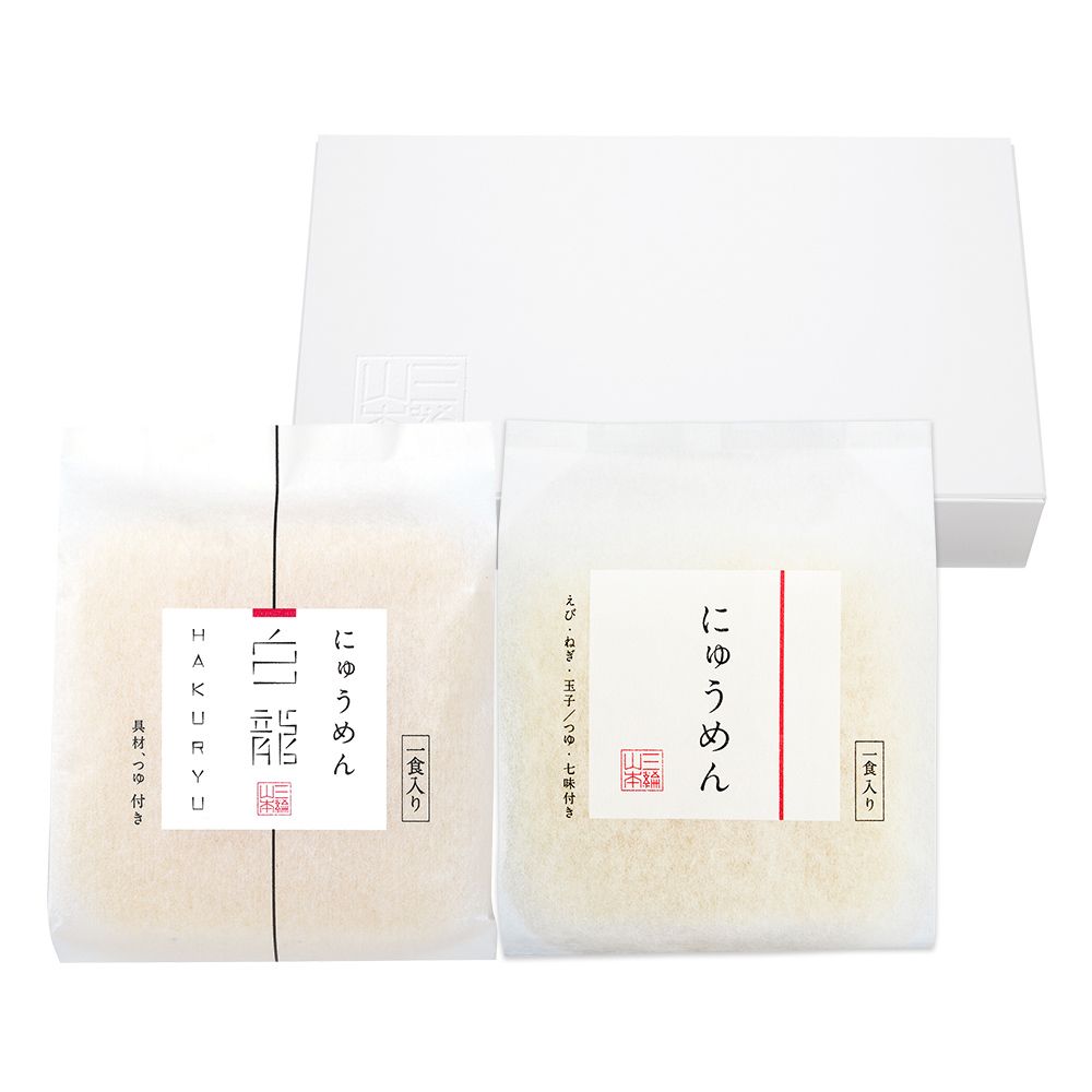 お湯を注いで、ラップをせずに電子レンジにかけるだけで、ゆがきたての食感をお楽しみいただけます。 ※セット内容の入れ替えは出来かねますのでご了承下さい 商品名 白龍にゅうめん・にゅうめんセット (V-HN-P) 名称 即席めん 内容量 白龍にゅうめん、にゅうめん 寸法(mm)縦×横×高さ 153×260×50 手提げ袋サイズ※別途購入下さい 小 保存方法 直射日光をさけ、常温で湿気の少ない所で保存して下さい。 賞味期限 賞味期限は約2ヵ月以上の商品をお届けしております。 原材料 セット商品につき、各製品に記載しております。 アレルギー ■白龍にゅうめん 小麦・えび・大豆・ごま・さば ■にゅうめん 小麦・卵・えび・大豆・ごま アレルギー表記について詳しくはこちらをご覧下さい 容器 紙箱 調理方法 器にめんとお湯を入れ、ラップをせずに電子レンジで加熱。めんつゆ(だし)と具材を入れて出来上がり。お鍋でも調理していただけます。 注意事項 ●用途:(必須) ・ギフト用(包装あり)、ギフト用(包装あり・持参用)、ご家庭用(包装なし)よりご選択下さい。 ・ギフト用(包装あり・持参用):商品到着後に贈答用としてご持参される場合にご利用下さいませ。 ・手提げ袋をご希望の場合は、別途ご購入ページよりご注文ください。 ●のし表書き「内のしでご用意」(必須) ・のし不要の場合は、「のしなし」をご選択下さい ・「外のし」をご希望の場合は、下記項目へご入力下さい。 ●希望の表書きがない場合・外のし希望の方 ・ご希望の表書きが選択肢にない場合「その他」を選択し、上記の空欄にご入力下さい。 ・外のしご希望の場合、上記の空欄に「外のし希望」とご入力下さい ●名入れ ・のしの下段に名入れをご希望の場合はご入力下さい。 ・入力が無い場合は「名入れなし」となります。 【ご注意】 ・ご連名の場合は、入力された順に右から左へ名入れ致します。その際、お名前は「、」で区切って下さい。 ・ふりがなをご希望の場合は( )でご入力下さい。 ・環境(機種)依存文字や旧字体はご利用頂けません。 ・入力できない文字をご希望の場合は詳細をご入力下さい。
