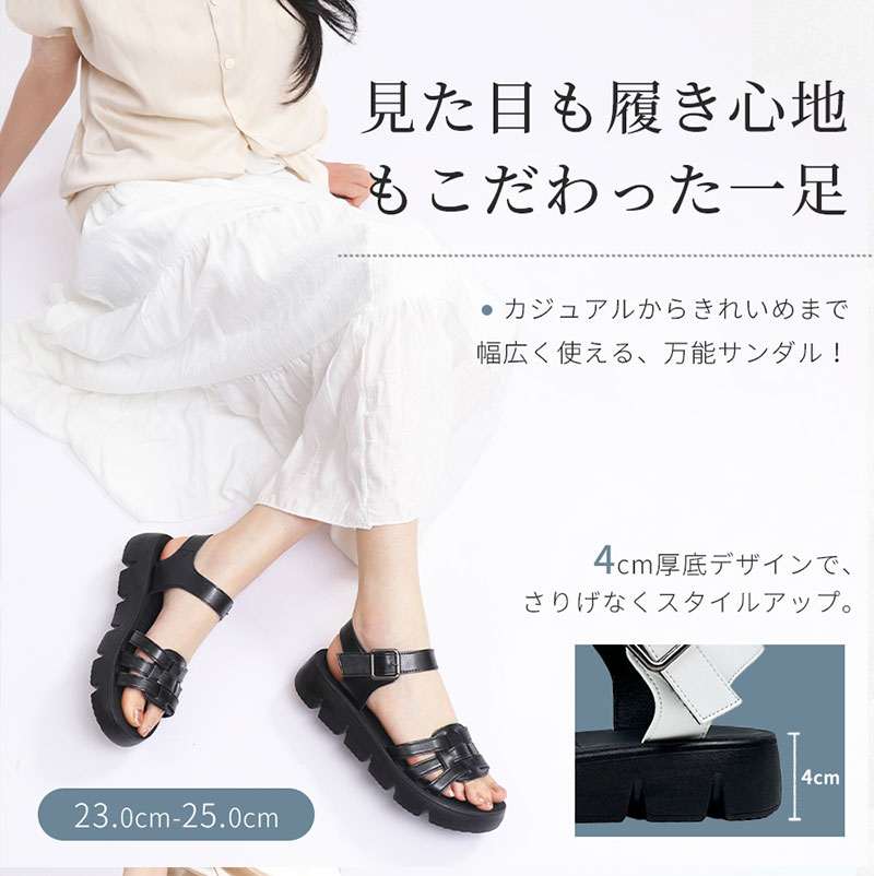 メーカー希望小売価格はメーカーカタログに基づいて掲載しています▼商品詳細▼ 品番 yz311 素材 アッパー:PUアウトソール:PU サイズ展開 23.0cm~25.0cm カラー ブラックホワイト 商品紹介文 【見た目も履き心地もこだわった一足】カジュアルからきれいめまで幅広く使える、万能サンダル!4cm厚底デザインで、さりげなくスタイルアップ。 【おしゃれ×実用性】金具バックルはデザインアクセント、実際は面ファスナー式で着脱ラクラク。見た目の可愛さと快適さを両立しました。軽くて柔らかいPU素材を採用し、長時間歩いても疲れにくい仕様。耐摩耗性·防水性にも優れ、デイリーユースにぴったり! 【ダブル滑り止め設計で安心の歩行】アウトソール(地面側)は滑りにくいパターン入り。インソール(足裏側)にも細かな滑り止め加工を施し、安定感アップ!「約4cmの厚底で脚長効果も◎」 【毎日使いたくなる】ワンピース、デニム、ショートパンツなど、どんなスタイルにもマッチ。「デイリーからレジャーまで大活躍間違いなし!」 関連キーワード グルカサンダル レディース 編みサンダル ぺたんこ おしゃれ ストラップ 大きいサイズ リゾート ローヒール サンダル 通気性 美脚 シンプル カジュアル スポサン サンダル ビーチサンダル ウォーキングシューズ スニーカーサンダル ブラック ホワイト レディース サンダル 歩きやすい 痛くない 疲れない クッション 定番 美脚 脚長 上品 旅行 おでかけ デート 通勤 オフィス おしゃれ オシャレ 大人かわいい プレーン シンプル 無地 プレゼント ホワイトデー 誕生日 ママコーデ コーデ 大人カジュアル モード スタイリッシュ 春 夏 秋23.0cm 23.5cm 24.0cm 24.5cm 25.0cm 黒 ブラック女性 美脚 美脚効果 脚長 脚長効果 身長アップ 4cm 関連商品はこちら